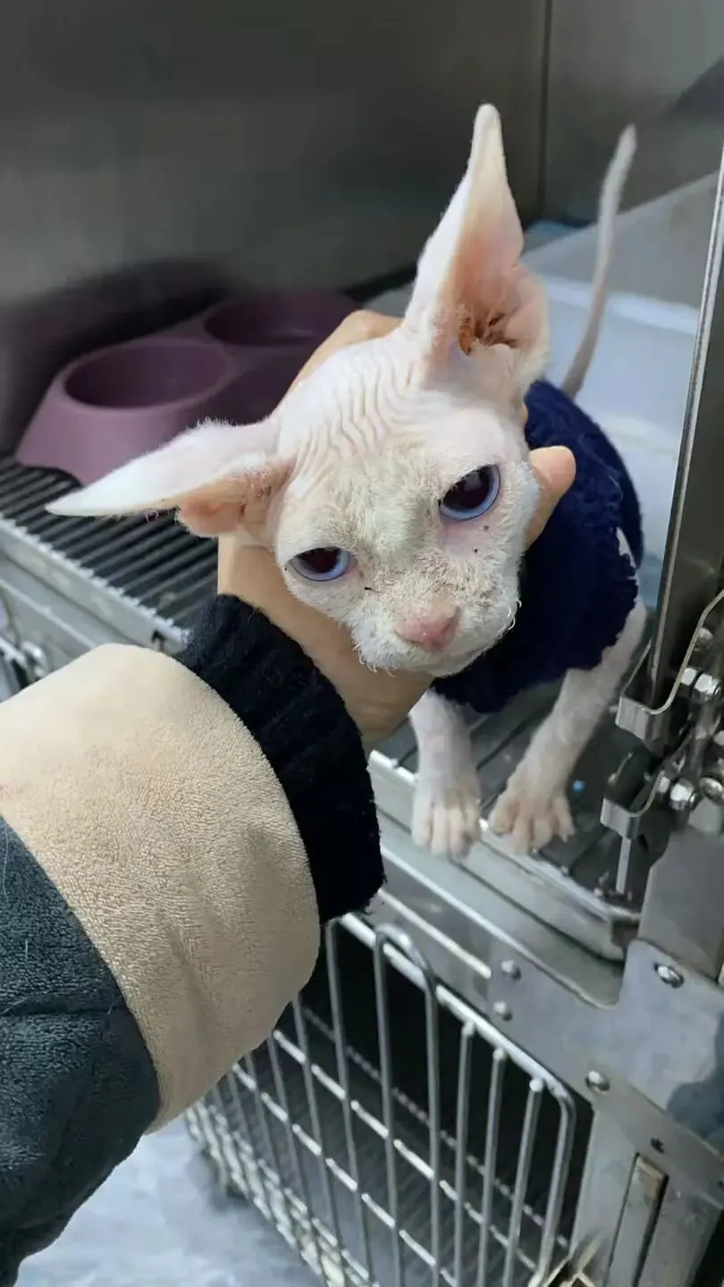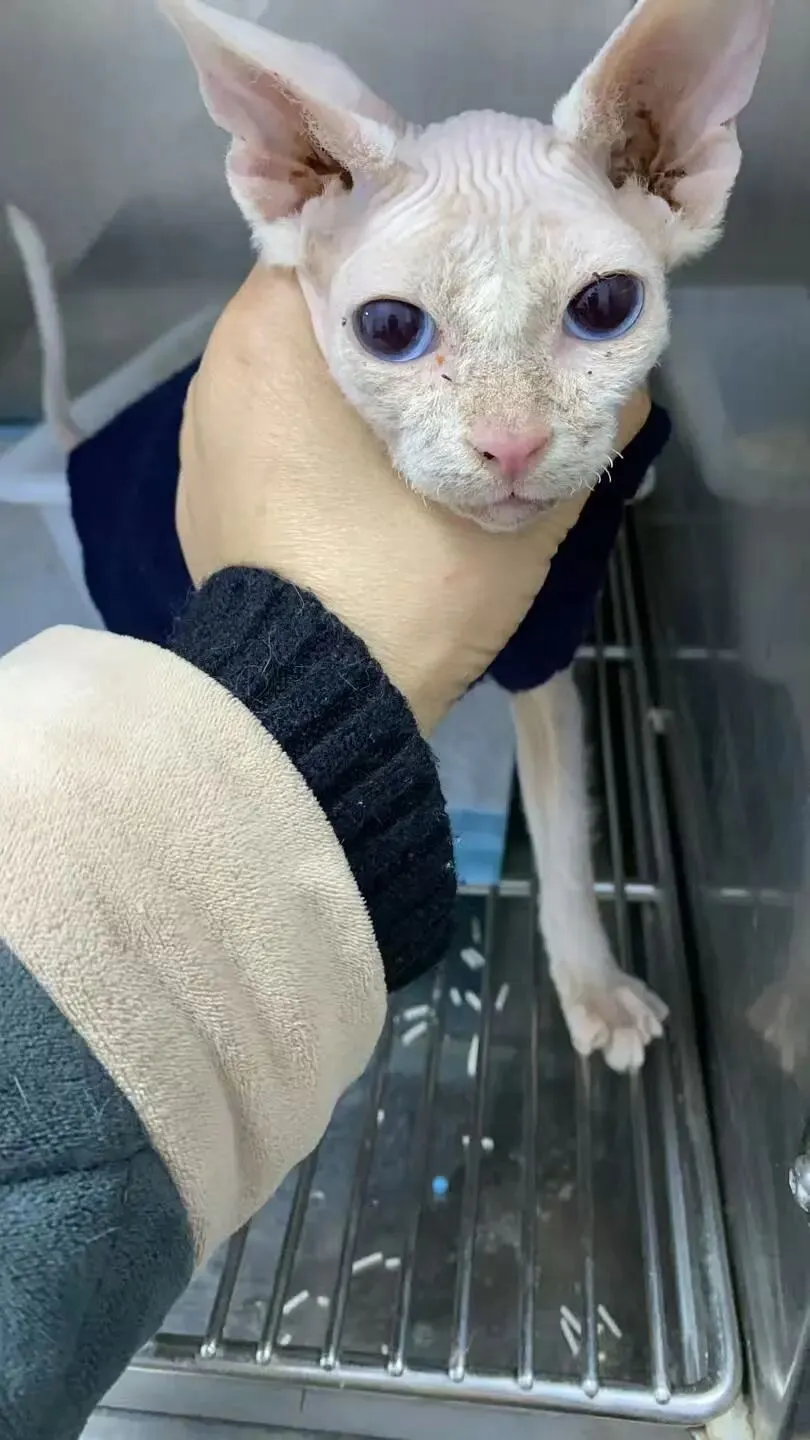 无毛猫,正常情况下应该在温暖的猫窝里打滚,在被窝里钻来钻去,在主人怀里晒太阳。但它没有——因为需要悉心照顾,垃圾人春节窜走前,它被遗弃了。