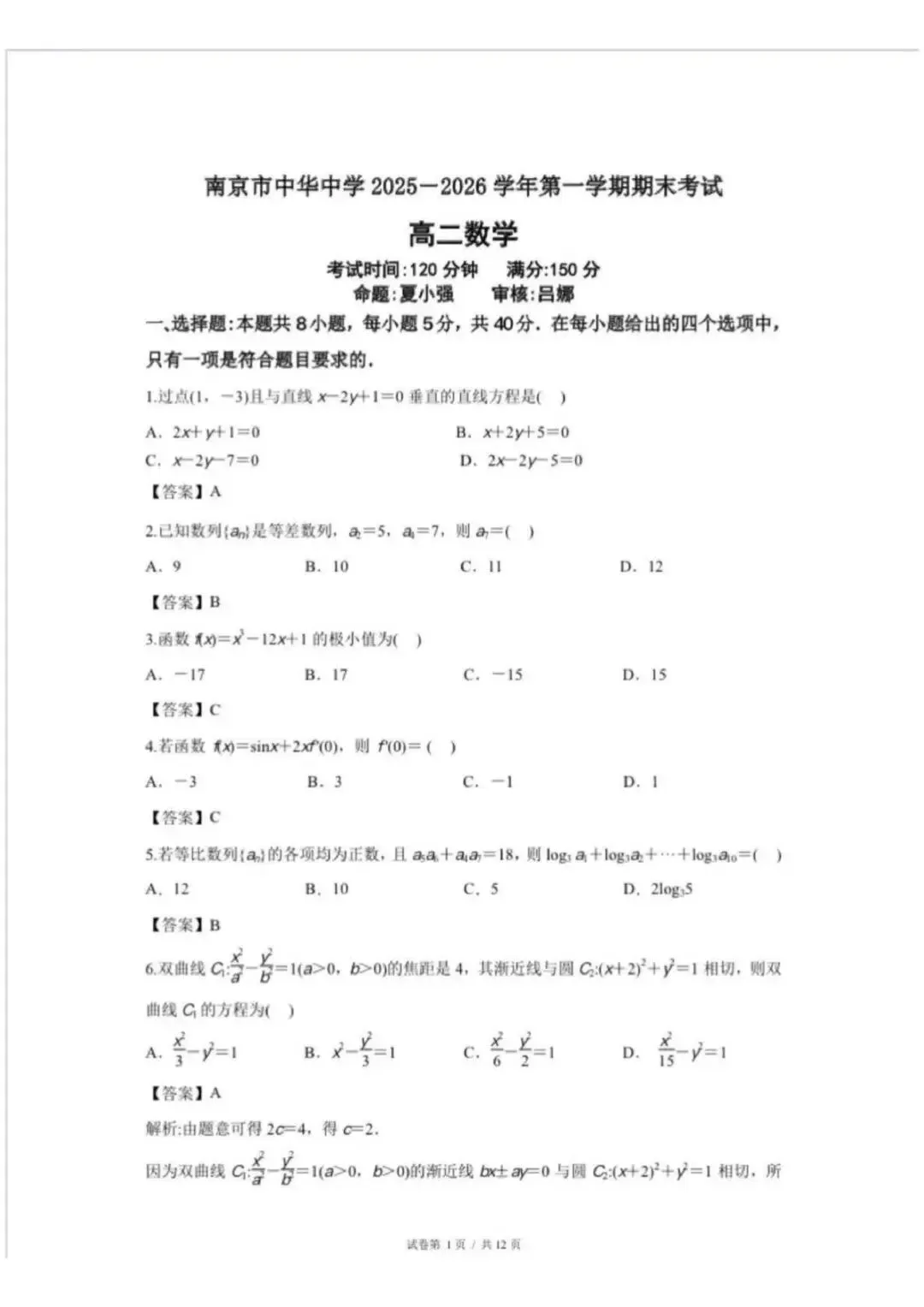 今天给大家整理江苏南京中华中学2025-2026学年高二上学期1月期末数学试题,读高中的同学快收藏起来学习吧~