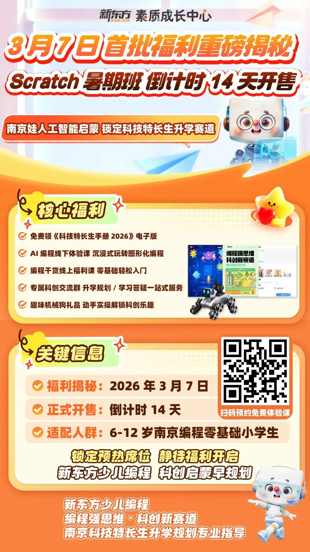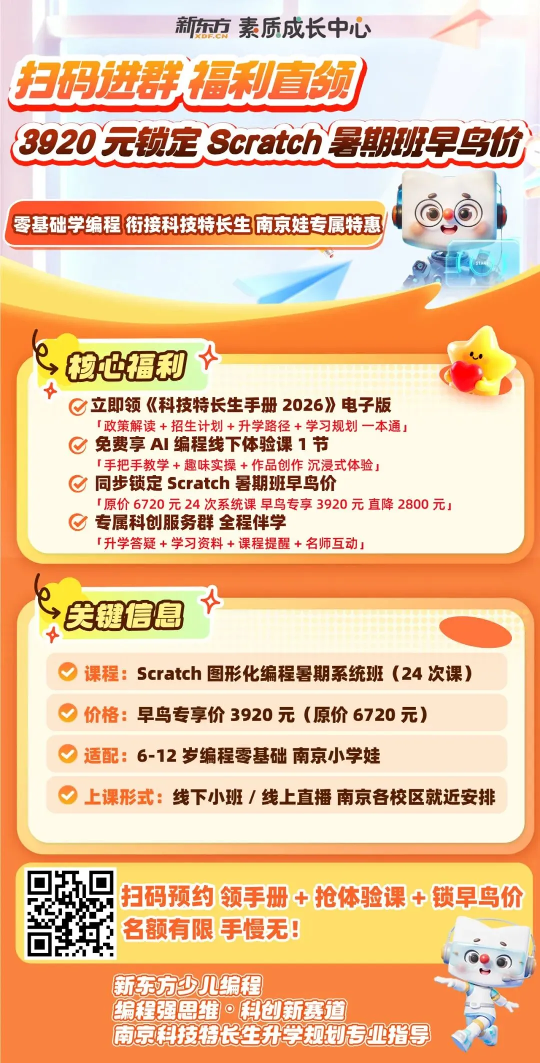 课程依托新东方30年教育积淀,我们打造了适配南京本地科技特长生需求的少儿编程体系,从启蒙到信奥冲刺全链路覆盖,让孩子学的每一步都有规划、有收获!
