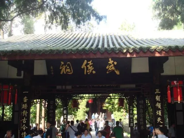转身凝望下联,“云霄如在”四字骤然拔高意境。抬头望去,武侯祠的匾额在阳光下熠熠生辉,仿佛诸葛武侯的英灵仍在云霄之上俯瞰人间。他“鞠躬尽瘁,死而后已”的精神,历经千年风雨而不泯。晚清光绪七年,薛时雨先生募资重建武侯祠,将这份精神薪火相传。祠内的浮雕上,诸葛亮驻马观山的身影栩栩如生,羽扇轻摇间,似有风云汇聚。站在这里,仿佛能感受到他的目光穿越时空,与历代文人墨客的敬意相遇,这“如在”的云霄,是精神的永恒,是信仰的传承。