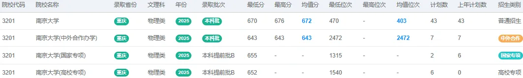 看近三年的趋势,物理类的位次有些波动。2023年是1620名,2024年是3219名,2025年是470名,今年比去年提高了不少。这说明物理类考生今年考南大的竞争比前两年更激烈了。历史类2025年是167名,这个位次在全国顶尖高校里是正常的。