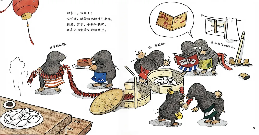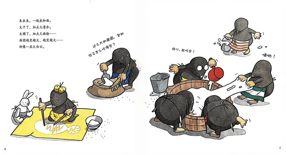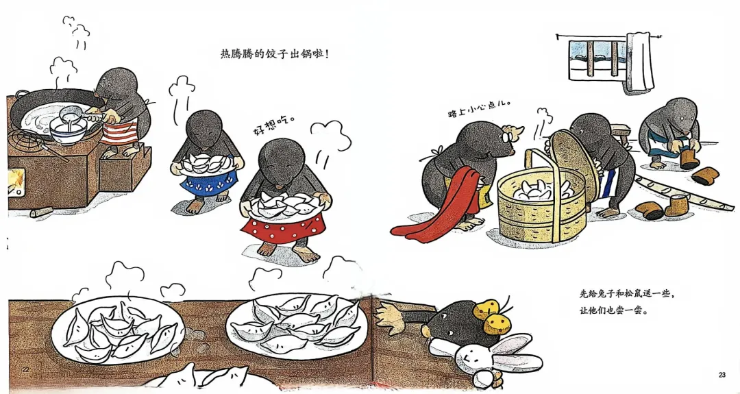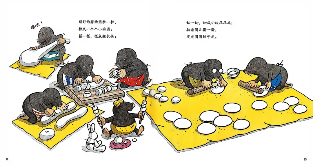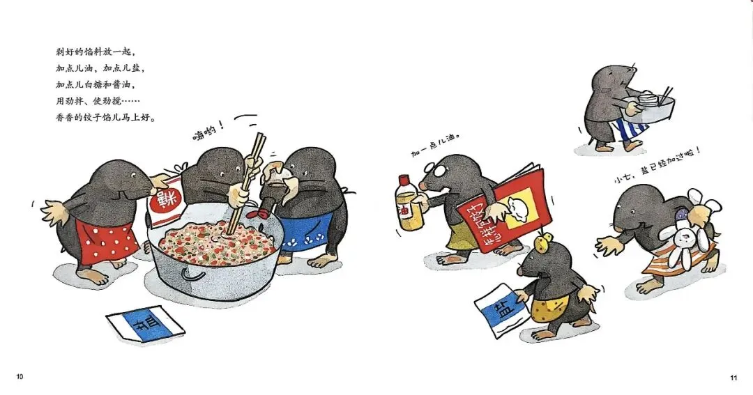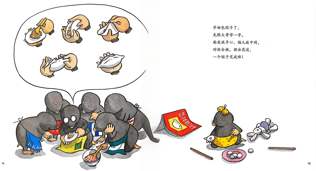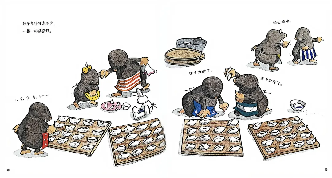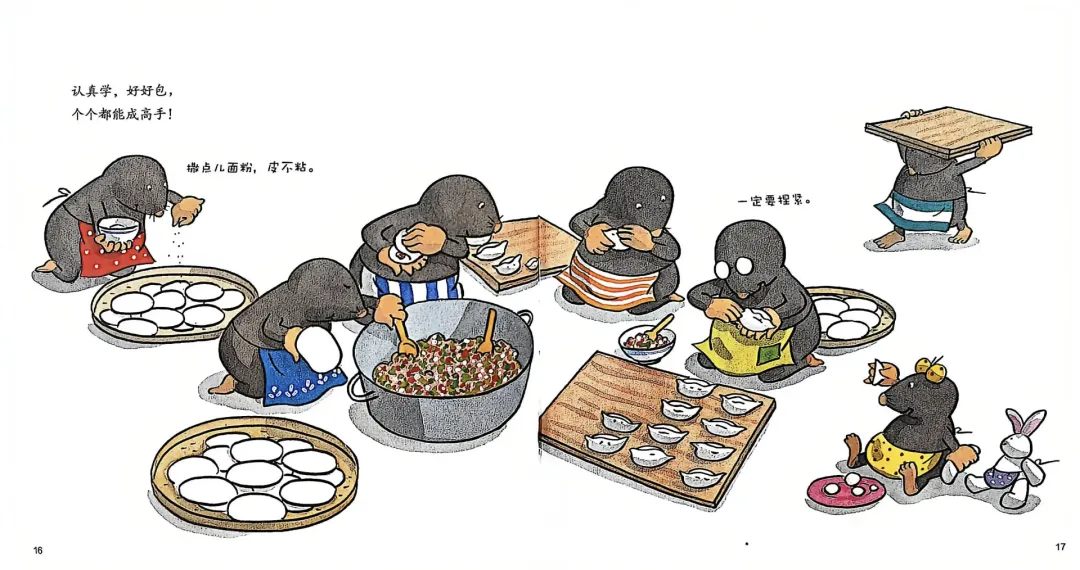 故事导读:该绘本讲述了七只个性鲜明的鼹鼠分工协作包饺子的温馨故事。情节按照包饺子的真实步骤展开:从和面、调馅儿,到包饺子、煮饺子,最后鼹鼠们不仅自己享用了劳动成果,还将热腾腾的饺子分享给朋友们(如兔子和松鼠),并因此收到了朋友们回赠的新年礼物,如鞭炮、贺卡等。
