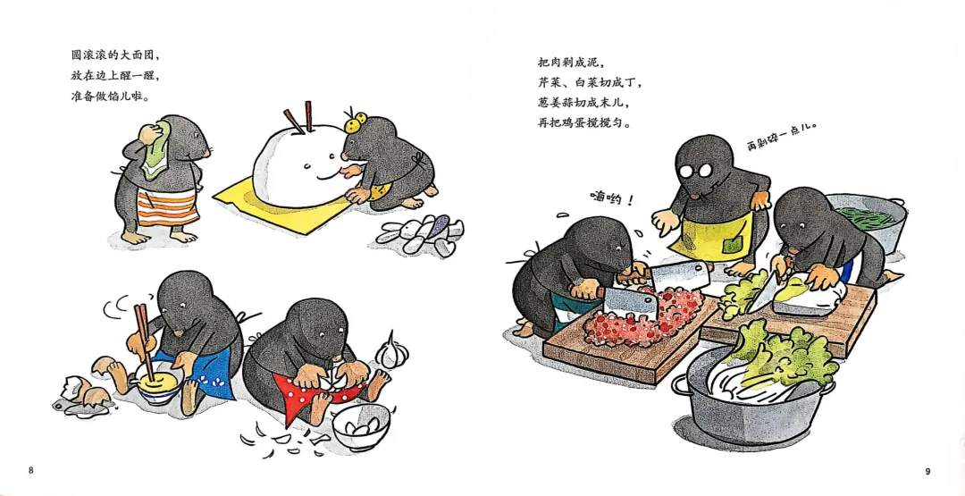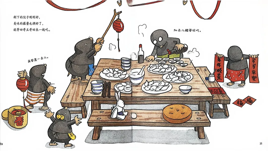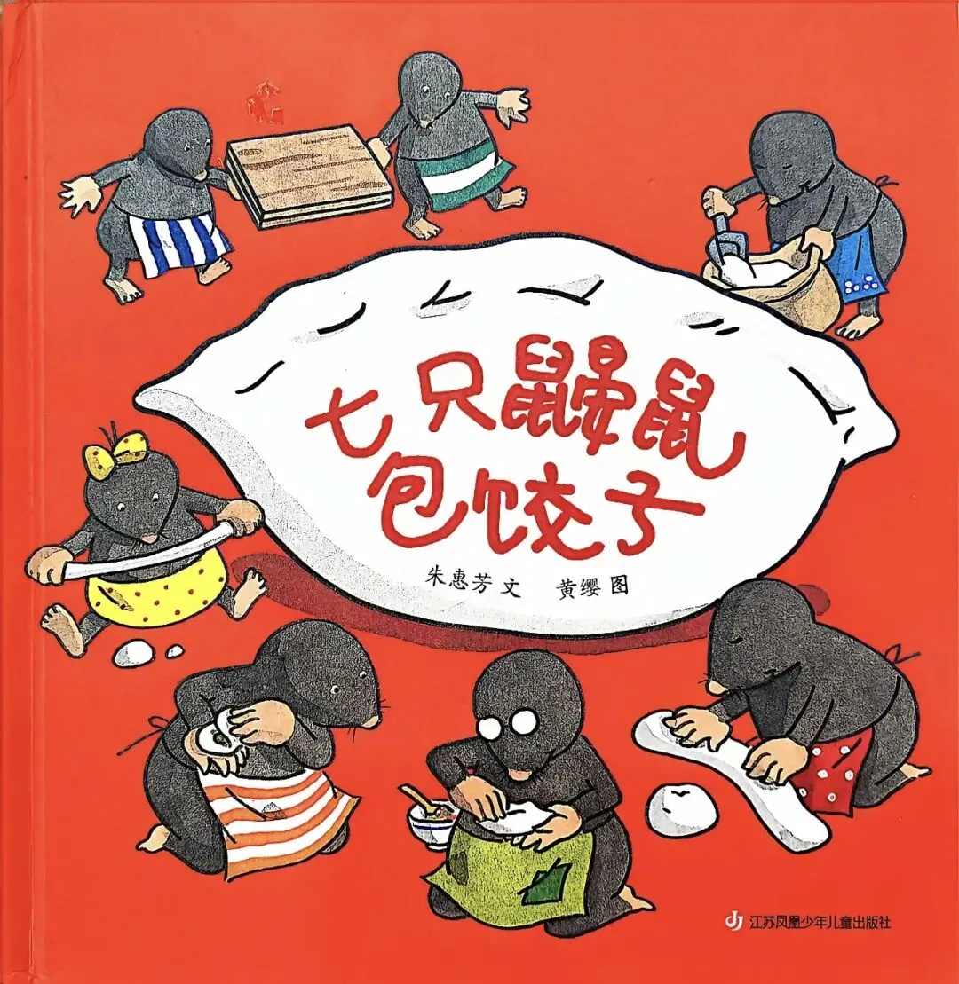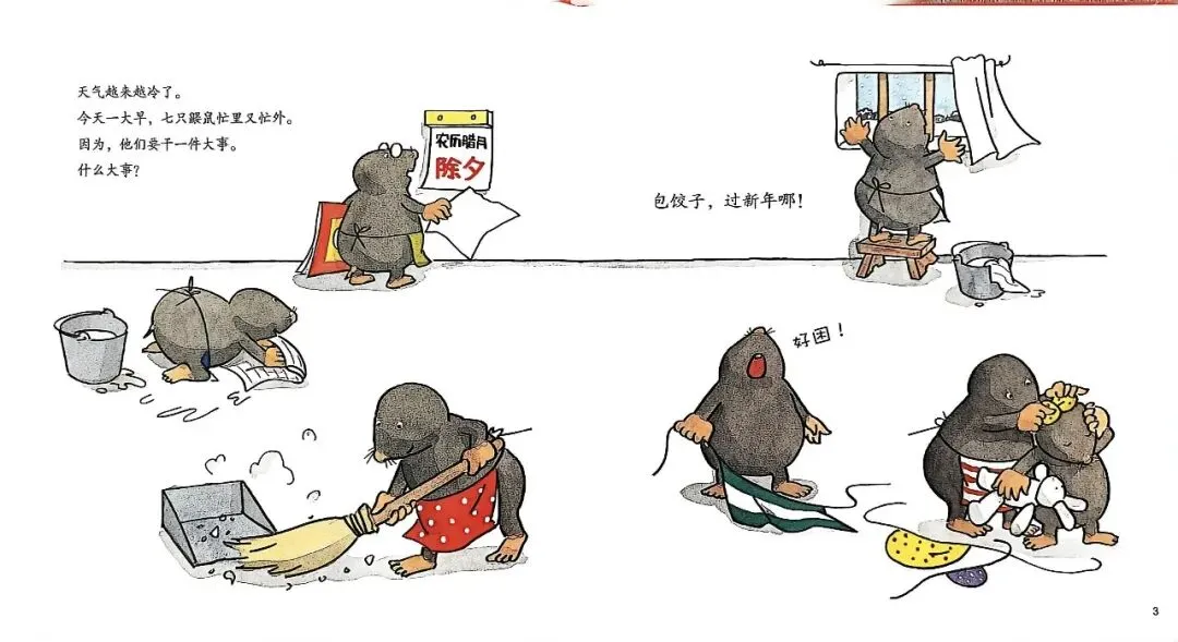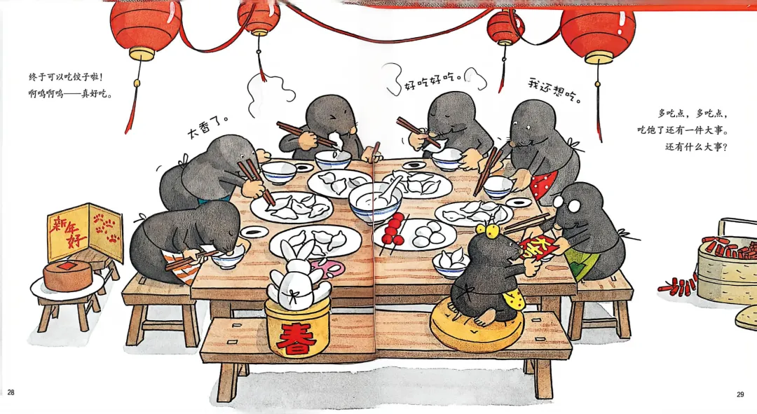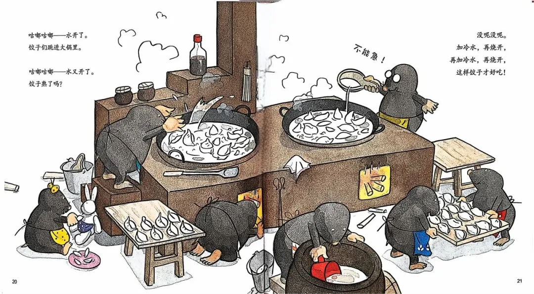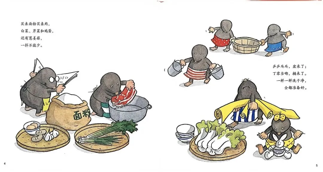 故事导读:该绘本讲述了七只个性鲜明的鼹鼠分工协作包饺子的温馨故事。情节按照包饺子的真实步骤展开:从和面、调馅儿,到包饺子、煮饺子,最后鼹鼠们不仅自己享用了劳动成果,还将热腾腾的饺子分享给朋友们(如兔子和松鼠),并因此收到了朋友们回赠的新年礼物,如鞭炮、贺卡等。