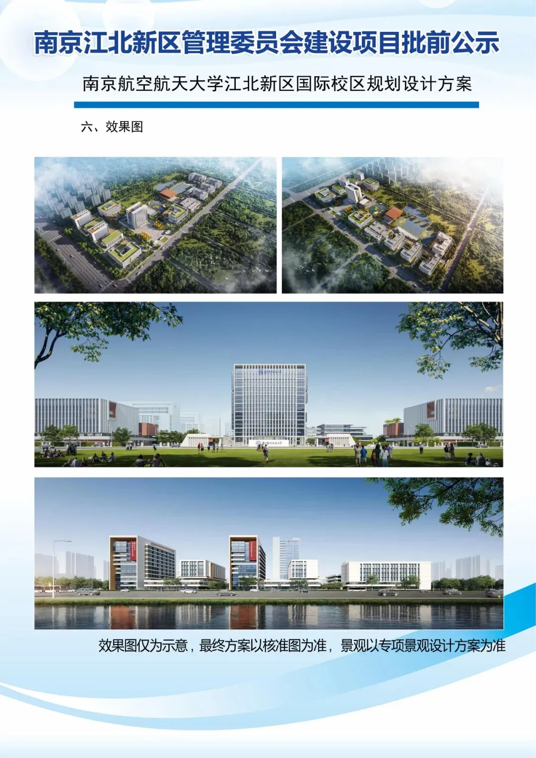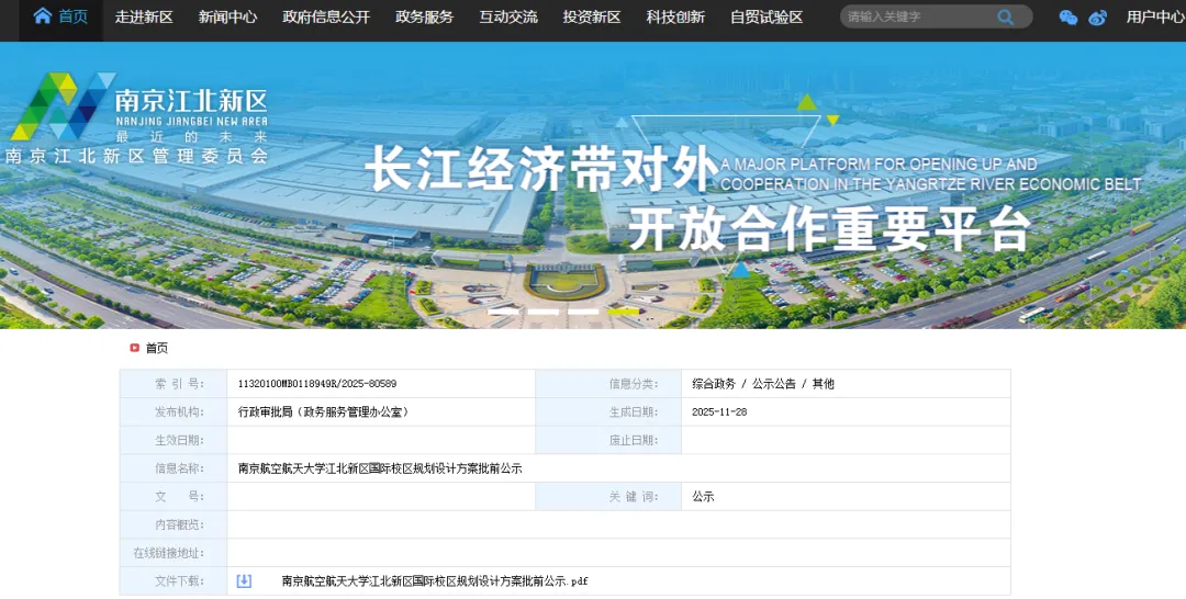 11月28日,南京江北新区管理委员会发布南京航空航天大学江北新区国际校区规划设计方案批前公示。公示时间为2025年11月28日至2025年12月7日。据南京航空航天大学官网,学校目前建有明故宫、将军路、天目湖三个校区,此次规划建设的新校区将成为第四个校区。南京航空航天大学江北新区国际校区规划设计方案批前公示