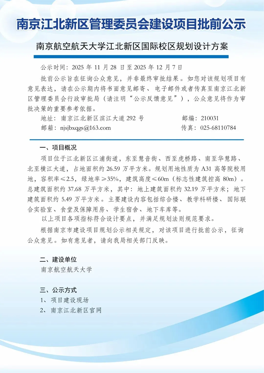 批前公示旨在征询公众意见, 并非最终审批结果 。 如您对该规划项目有意见表达, 请在公示期内将书面意见邮寄 、 电子邮件或者传真至南京江北新区管理委员会行政审批局(请注明“ 公示反馈意见 ”), 公众意见将作为审批决策的重要参考依据。