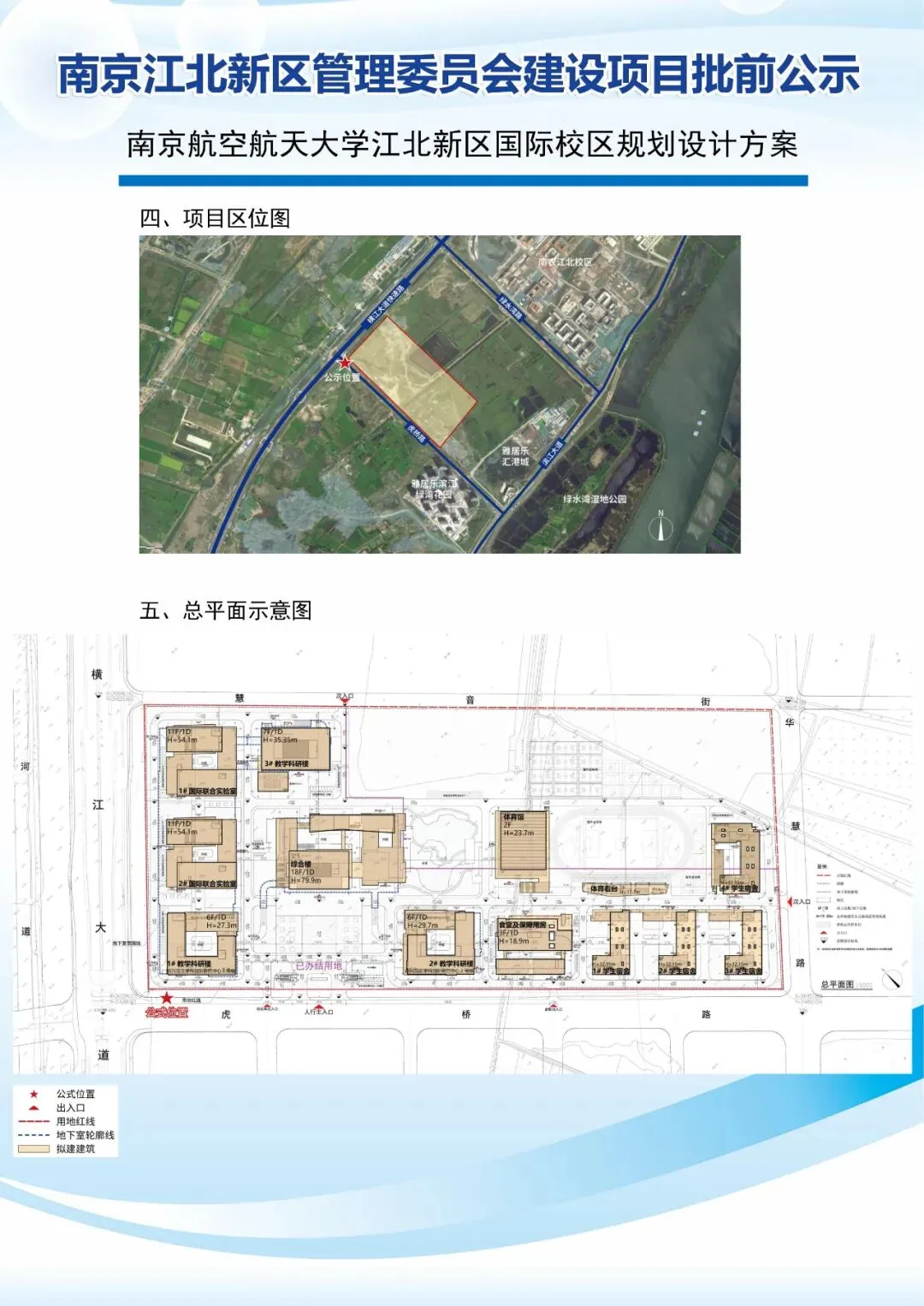 项目位于江北新区江浦街道,东至慧音街 、西至虎桥路 、南至华慧路 、北至横江大道, 占地面积约 26.59 万平方米。规划用地性质为 A31 高等院校用地, 容积率≤2.5, 绿地率≥35%, 建筑高度≤60m(标志性建筑控高 80m)。总建筑面积约 37.68 万平方米, 其中: 地上建筑面积约 32.19 万平方米; 地下建筑面积约 5.49 万平方米 。 主要建设内容包括综合楼 、 教学科研楼 、 国际联合实验室 、 食堂及保障用房 、 学生宿舍 、 地下车库等。