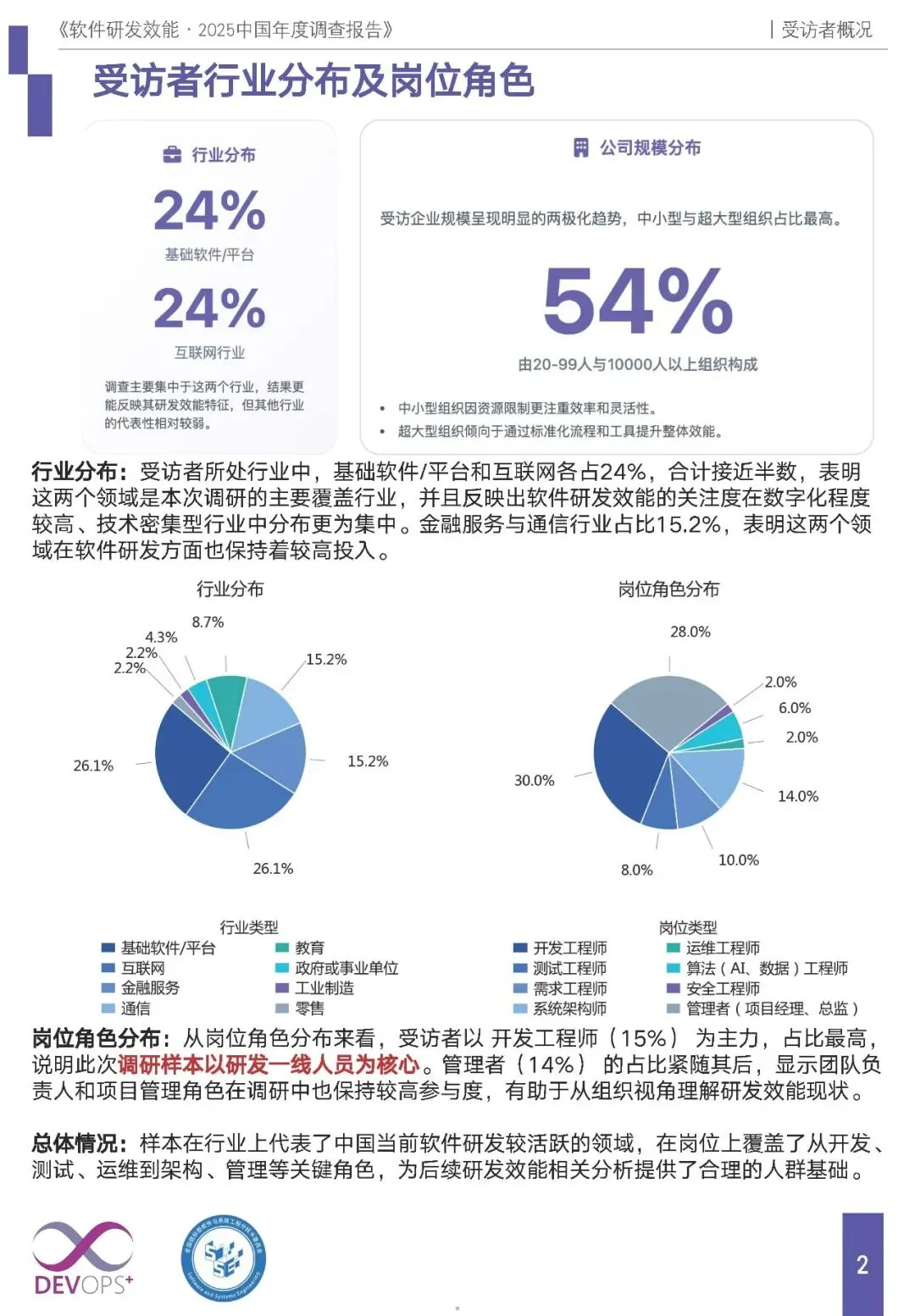 行业与岗位:调研核心覆盖基础软件 / 平台、互联网行业(各占 24%),金融与通信行业占 15.2%;受访者以开发工程师(15%)、管理者(14%)为主,一线研发与管理视角兼具。