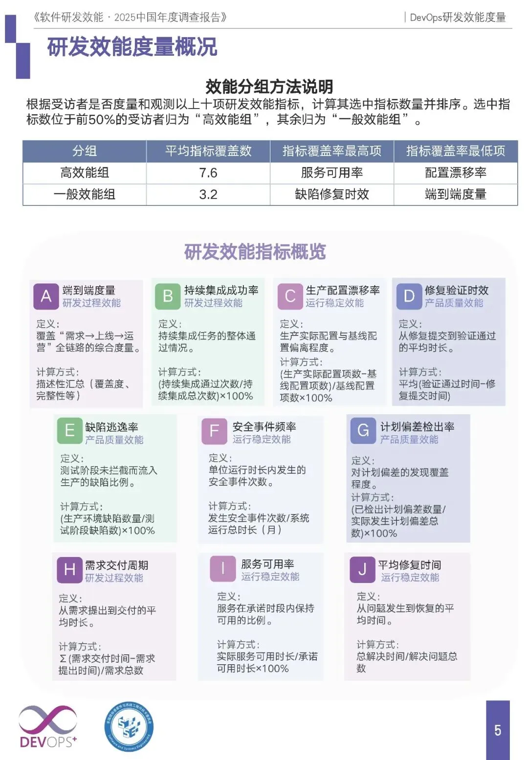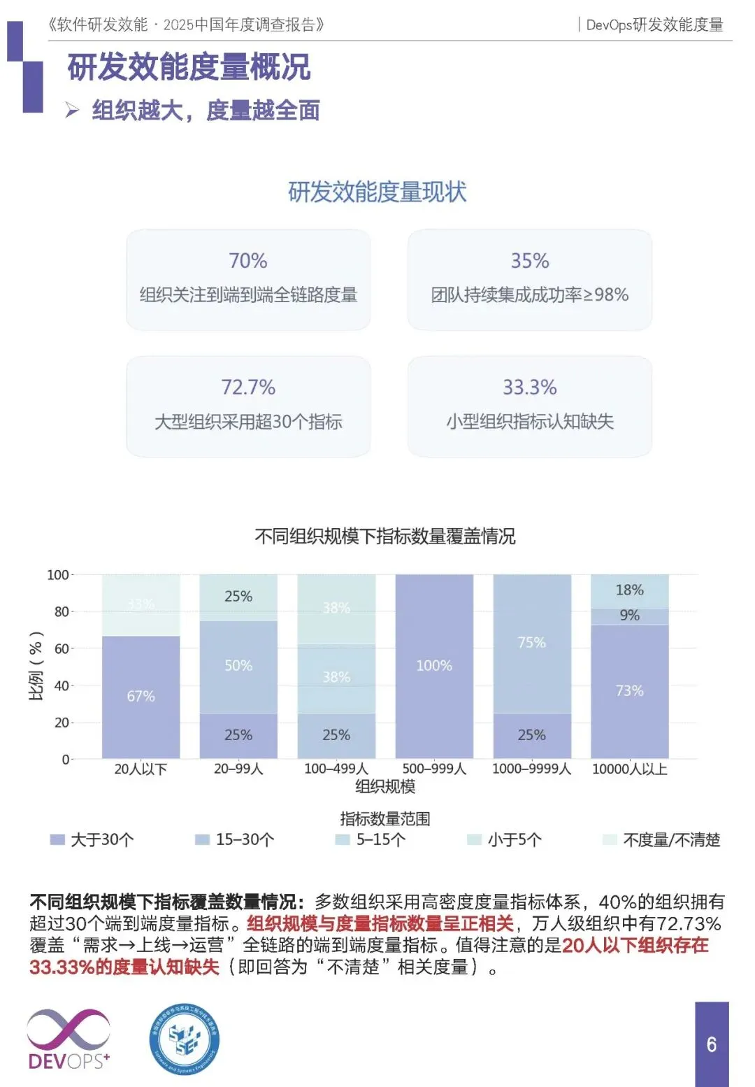 度量体系:定义端到端度量、持续集成成功率等 10 项核心指标,按指标覆盖数分为高效能组(平均 7.6 项)与一般效能组(平均 3.2 项);组织规模与度量全面性正相关,万人级企业 72.73% 实现端到端全链路度量,20 人以下小企业 33.33% 存在度量认知缺失。