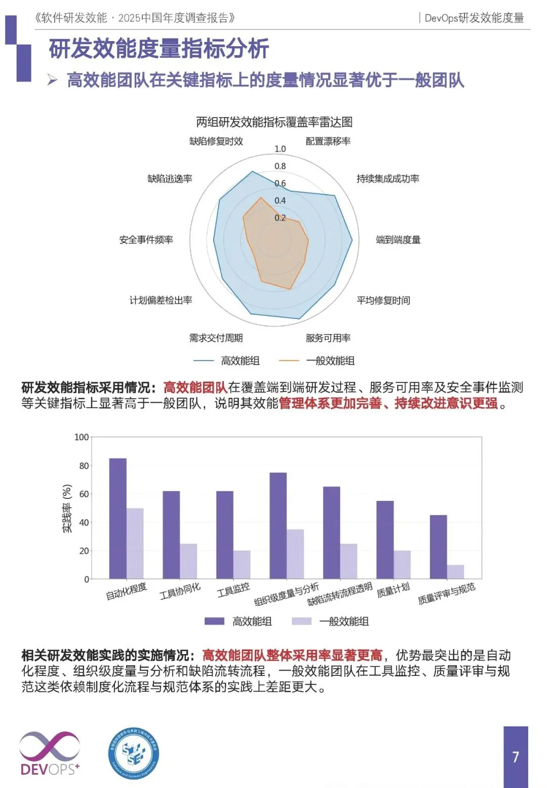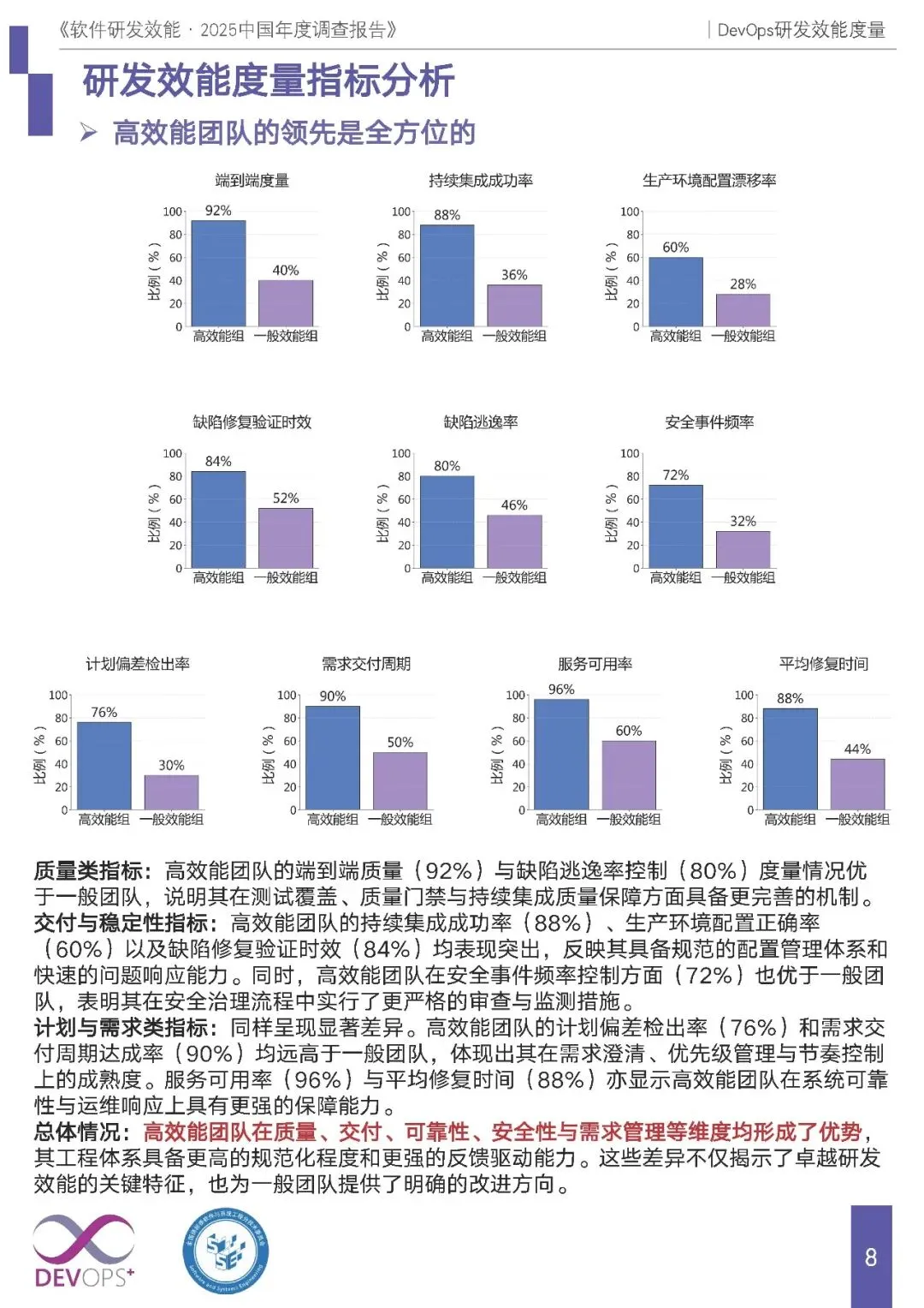 组间差异:高效能团队在所有指标上覆盖率均显著高于一般团队,其中服务可用率(96%)、端到端度量(92%)表现最优,在自动化程度、组织级度量等实践上优势突出,质量、交付、可靠性、安全性等维度形成全方位领先。