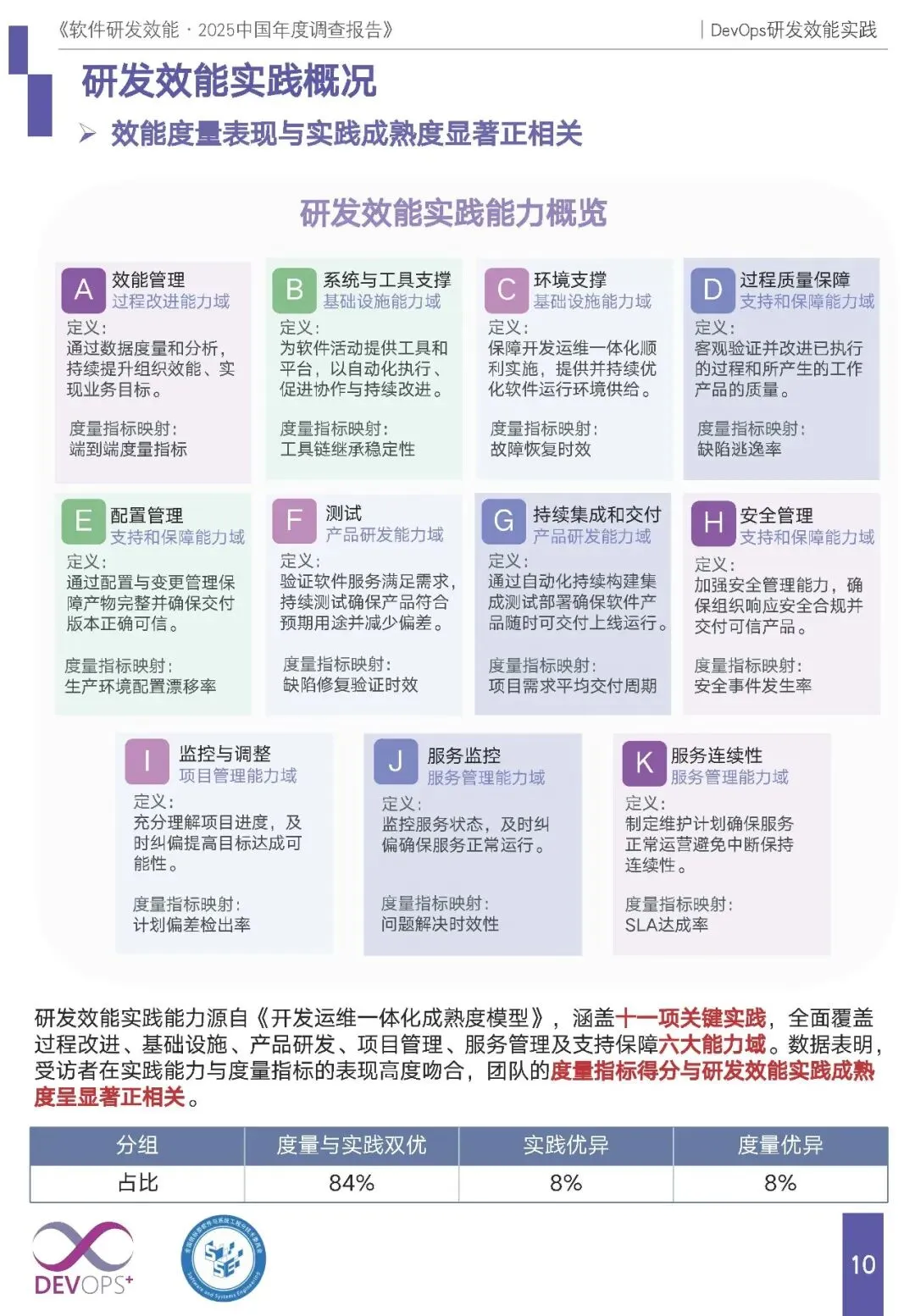 实践框架:基于国标形成覆盖 6 大能力域、11 项关键实践的体系,度量表现与实践成熟度显著正相关,84% 团队实现度量与实践双优。