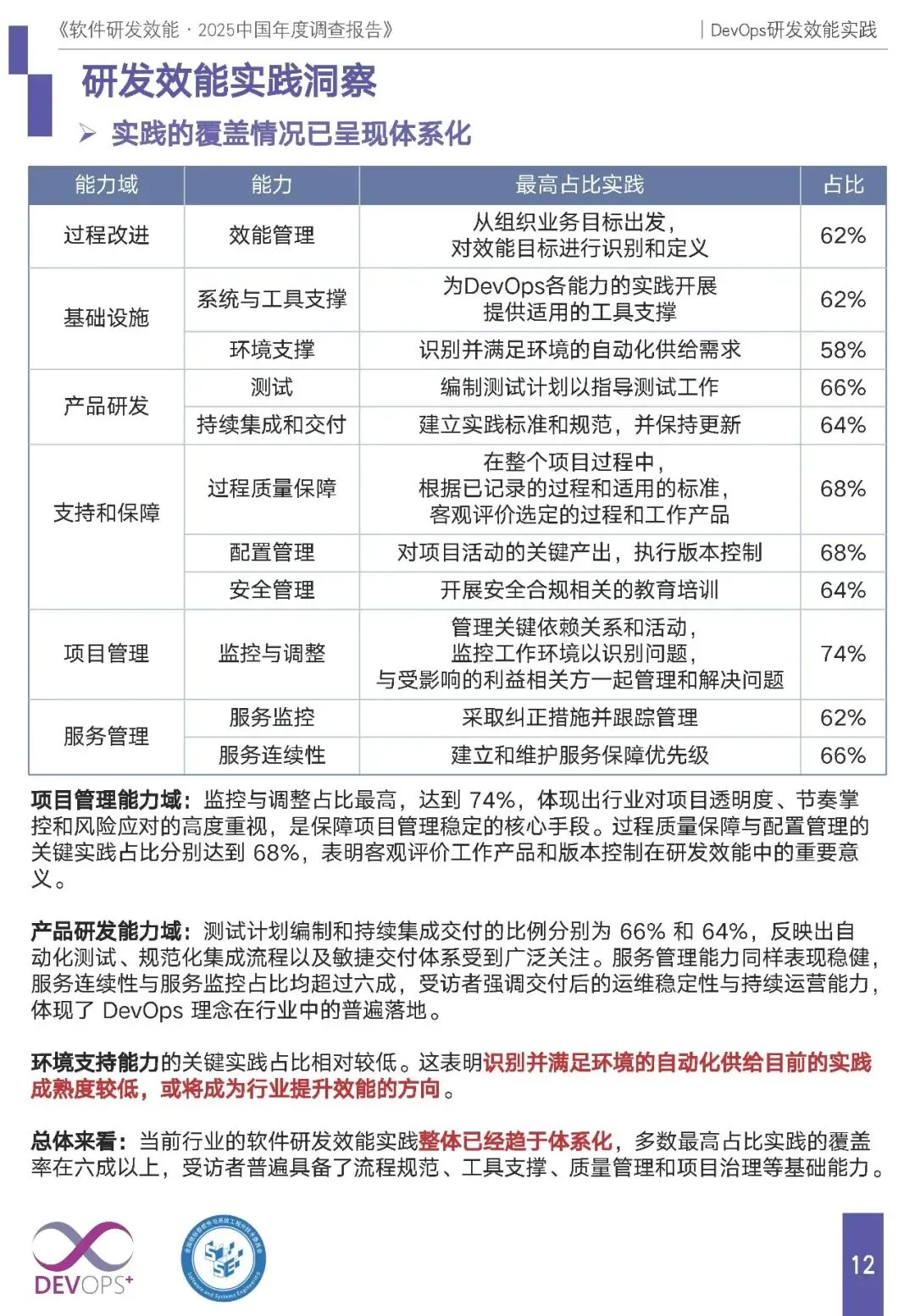 整体现状:实践已趋于体系化,多数核心实践覆盖率超 60%,项目管理的 “监控与调整” 占比最高(74%);但环境支撑是成熟度较低的能力域,自动化供给需求识别实践待提升。