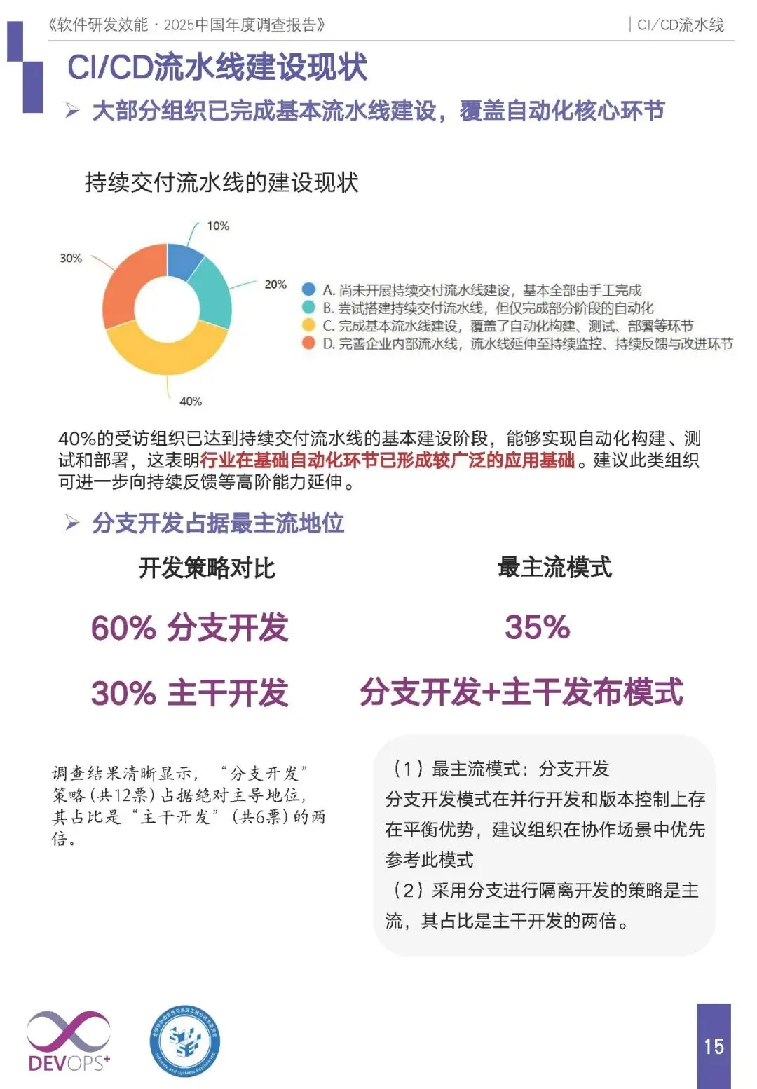 建设现状:40% 组织完成基本流水线建设,实现自动化构建、测试、部署;开发策略以分支开发为主(占比是主干开发的 2 倍),分支开发 + 主干发布为最主流模式。