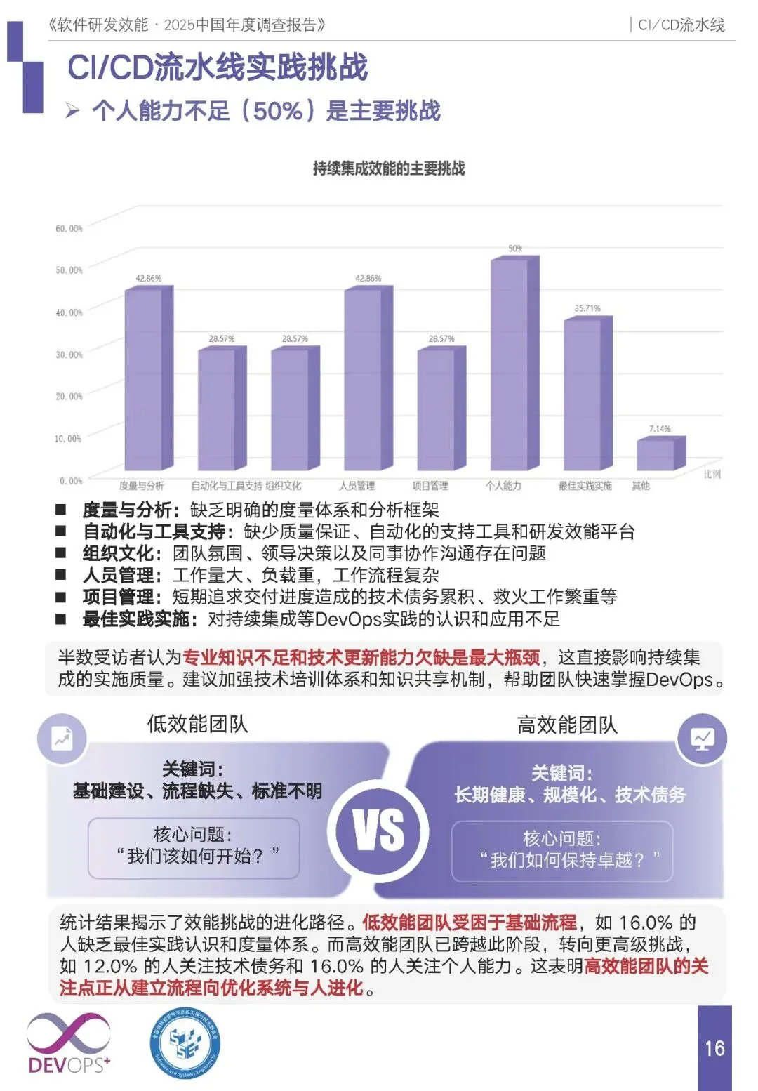 核心挑战:个人能力不足(50%)是持续集成最大瓶颈,其次为度量与分析、自动化工具支持缺失;低效能团队困于基础流程缺失,高效能团队则关注技术债务、规模化优化等高阶问题。