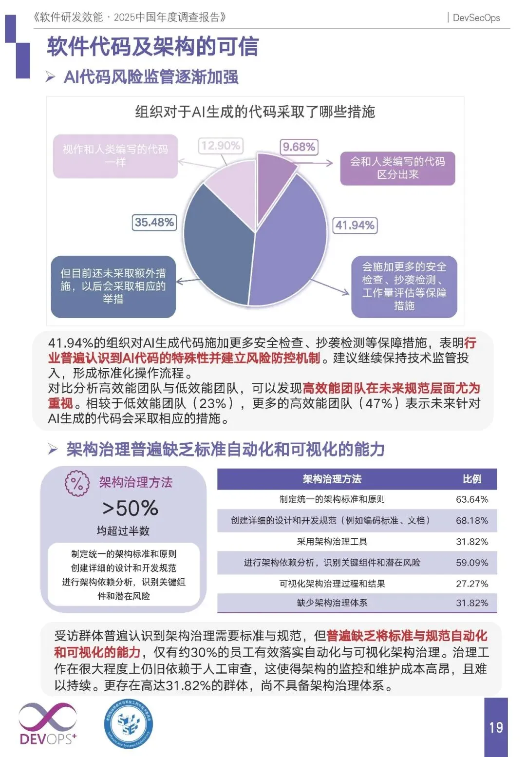 AI 代码与架构治理:41.94% 组织对 AI 生成代码施加额外安全检查,高效能团队更重视未来规范;架构治理虽重视标准制定(超 50%),但自动化、可视化能力缺失,仅 30% 落实相关工具,31.82% 组织无架构治理体系。