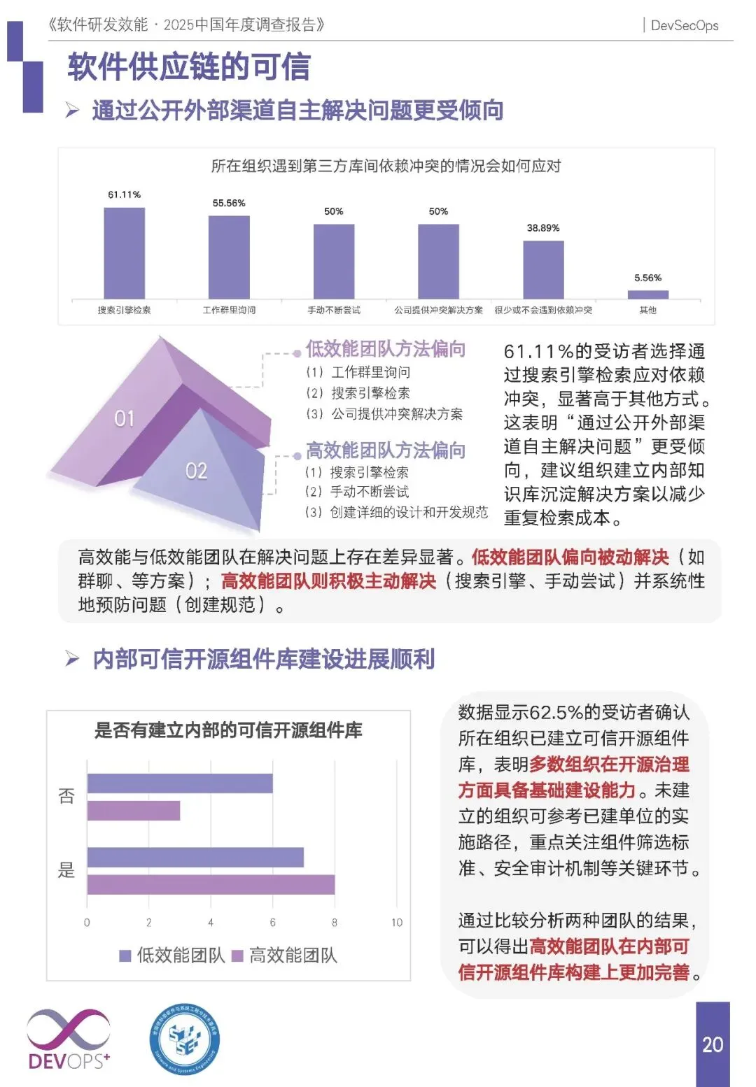 软件供应链可信:61.11% 组织通过搜索引擎自主解决第三方库依赖冲突,高效能团队更主动尝试并建立预防规范;62.5% 组织已建内部可信开源组件库,高效能团队建设更完善。