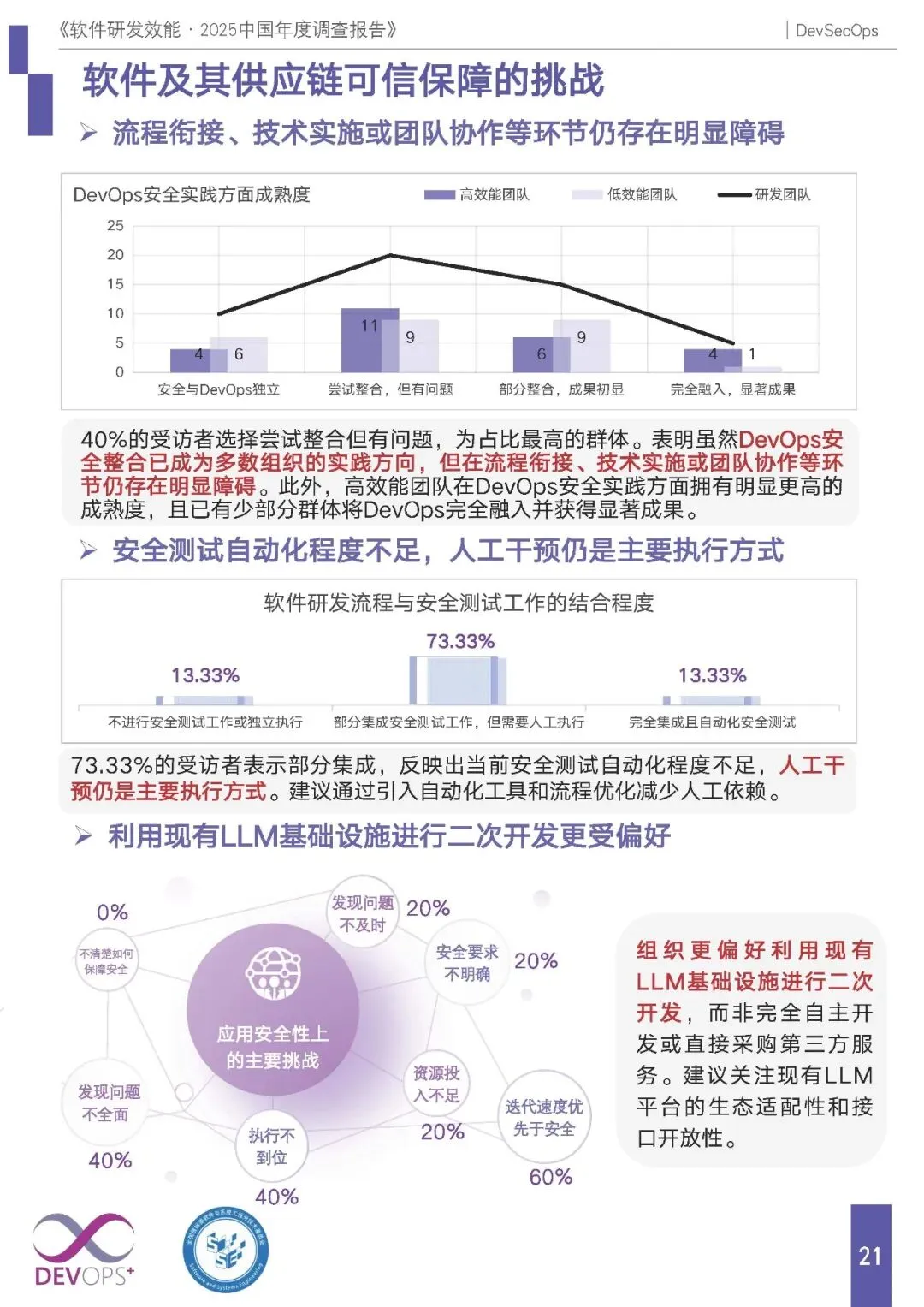 实践痛点:40% 组织尝试整合安全与 DevOps 但存在衔接障碍;73.33% 安全测试需人工执行,自动化程度低;执行不到位(40%)是应用安全性主要挑战,组织更偏好基于现有 LLM 基础设施二次开发。