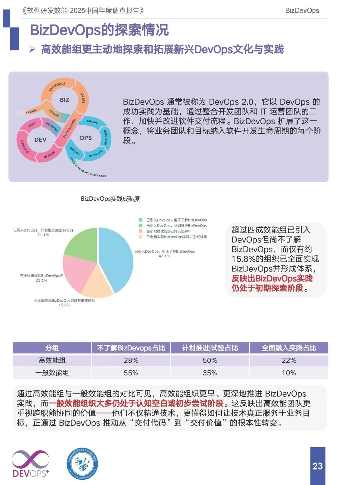 实践现状:作为 DevOps 2.0,将业务团队纳入研发全生命周期,但整体仍处探索期,仅 15.8% 组织全面实现并形成体系,42.1% 组织引入 DevOps 但不了解 BizDevOps;高效能组推进更深入,仅 28% 不了解,50% 计划 / 试验落地。