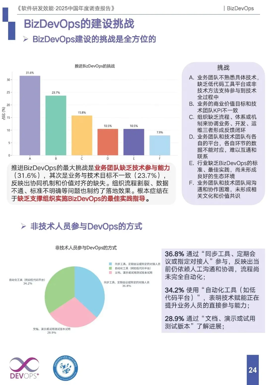 核心挑战:业务团队缺乏技术参与能力(31.6%)为最大难点,其次是业务与技术目标不一致(23.7%),流程割裂、数据不通、标准缺失等问题制约落地。