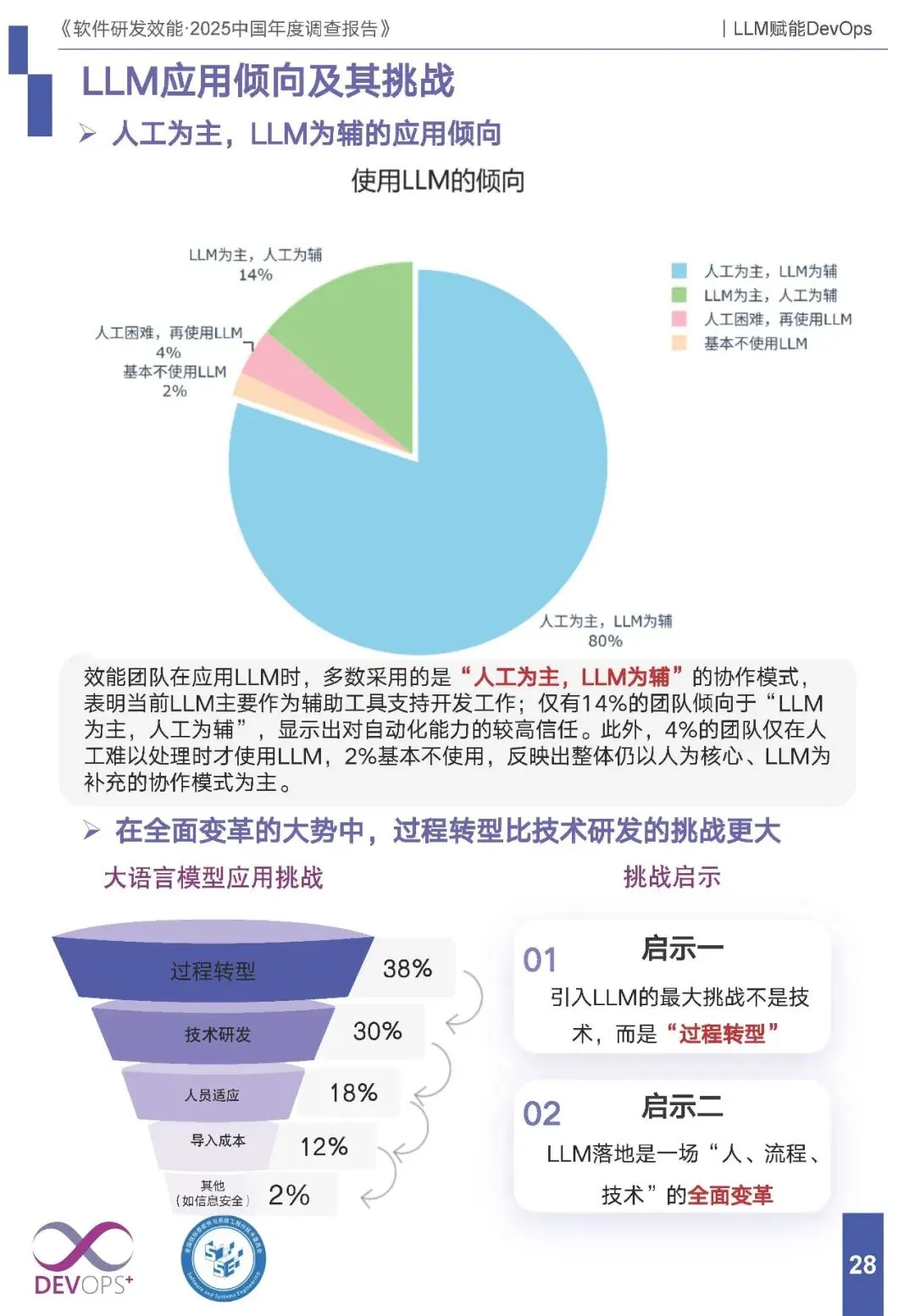 落地挑战:最大挑战并非技术研发(30%),而是过程转型(38%),其次是人员适应(18%),LLM 落地需要人、流程、技术的全面变革。