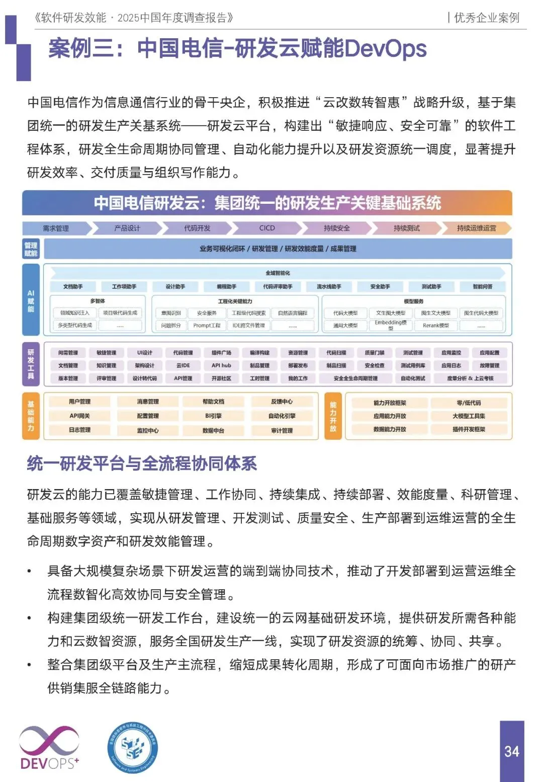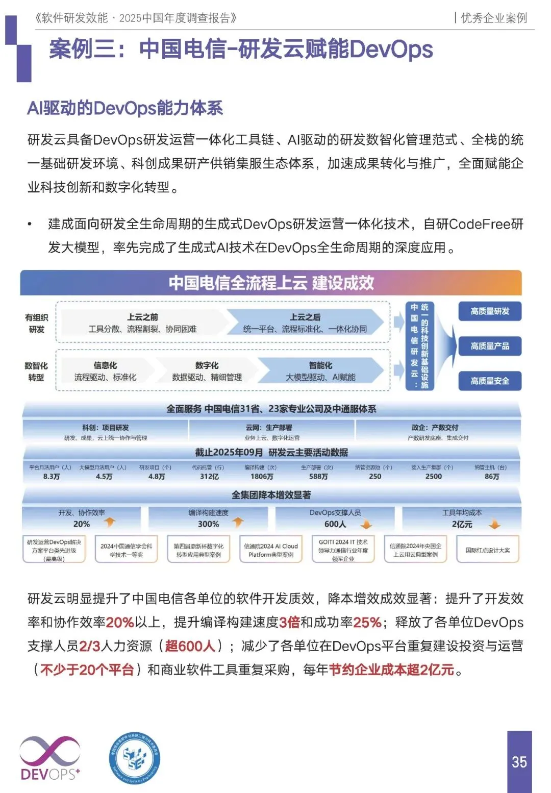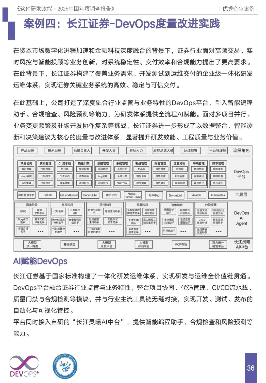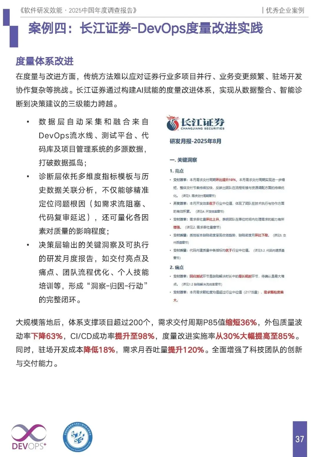 报告收录浪潮科技、云南电网、中国电信、长江证券等 8 家企业案例,覆盖科技、能源、通信、金融等行业,均以国标 GB/T 42560-2023 为指导,核心特征为全流程自动化、AI 赋能、数据驱动的度量改进,且均实现显著的降本增效: