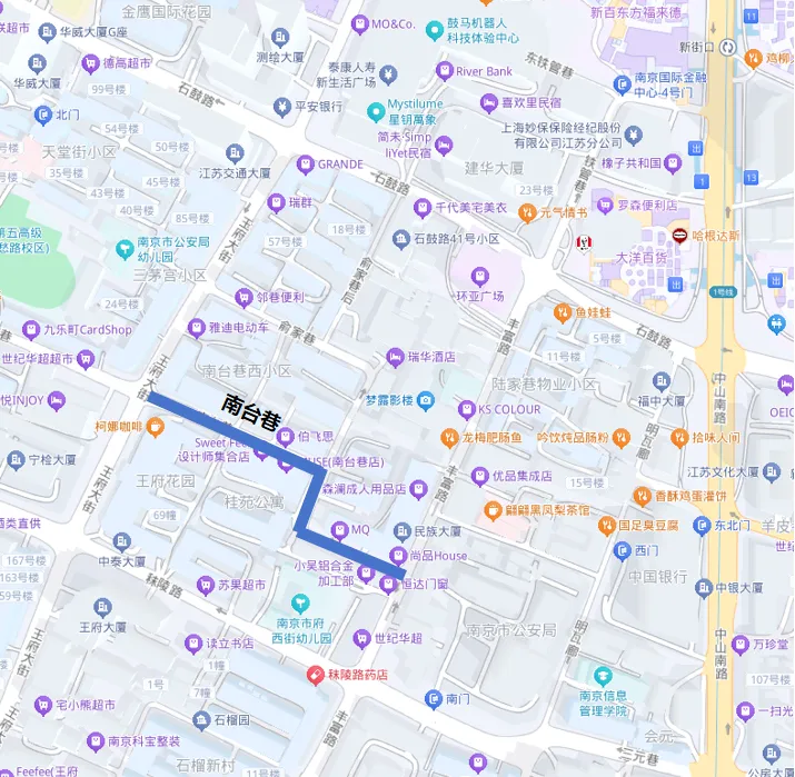 南台巷位于新街口附近,东起丰富路,西至王府大街,呈“Z”字形,全长近三百米。