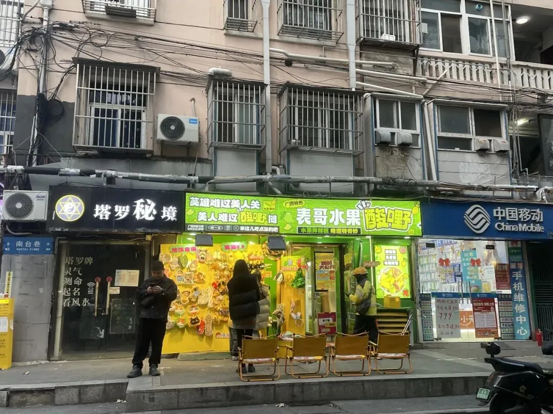 从丰富路拐进来,一眼望见塔罗牌占卜的小铺,旁边是一家辣椒水果店,装修极具夸张与漫画式。