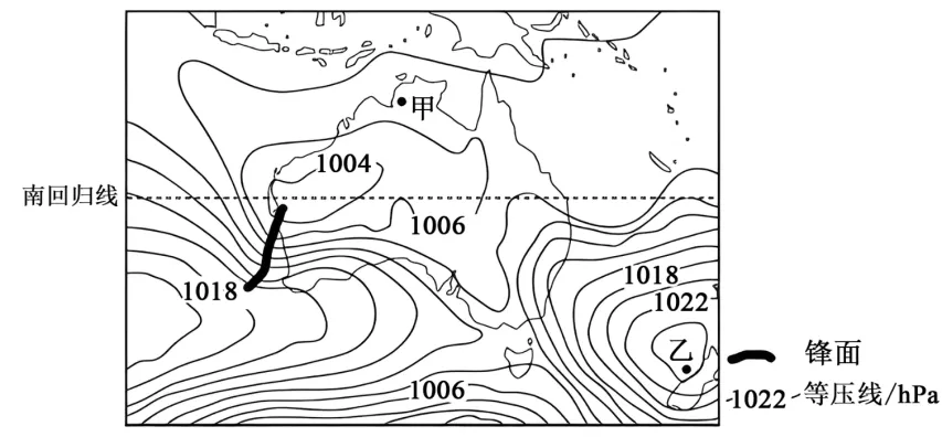下图为2025年某月某时澳大利亚及周边区域等压线分布示意图。据此完成下面小题。