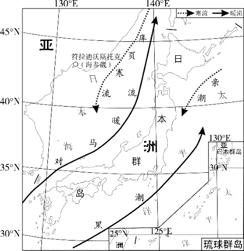 海雾是指低层大气水汽以微细盐粒等吸湿性微粒为核心不断凝结成细小的水滴、冰晶或两者的混合物,悬浮在海面以上几米、几十米乃至几百米低空,使能见度降低的天气现象。符拉迪沃斯托克位于亚欧大陆东北部,邻日本海。夏秋两季多海雾,6—8月平均雾日一个半月。下图为符拉迪沃斯托克地理位置和日本海洋流分布图。据此完成下面小题。