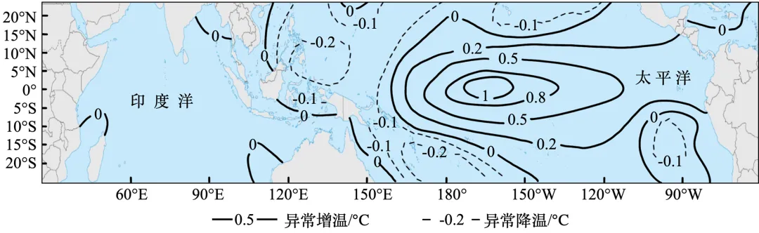 传统观点的厄尔尼诺指赤道附近太平洋东部表层海水温度异常升高的现象,厄尔尼诺对各地的气候具有复杂影响。20世纪80年代以来,科学家根据海温异常中心的位置,将厄尔尼诺分为东部型和中部型,传统观点的厄尔尼诺特指东部型,中部型厄尔尼诺的海温异常中心位于赤道附近太平洋中部(下图)。据此完成下面小题。