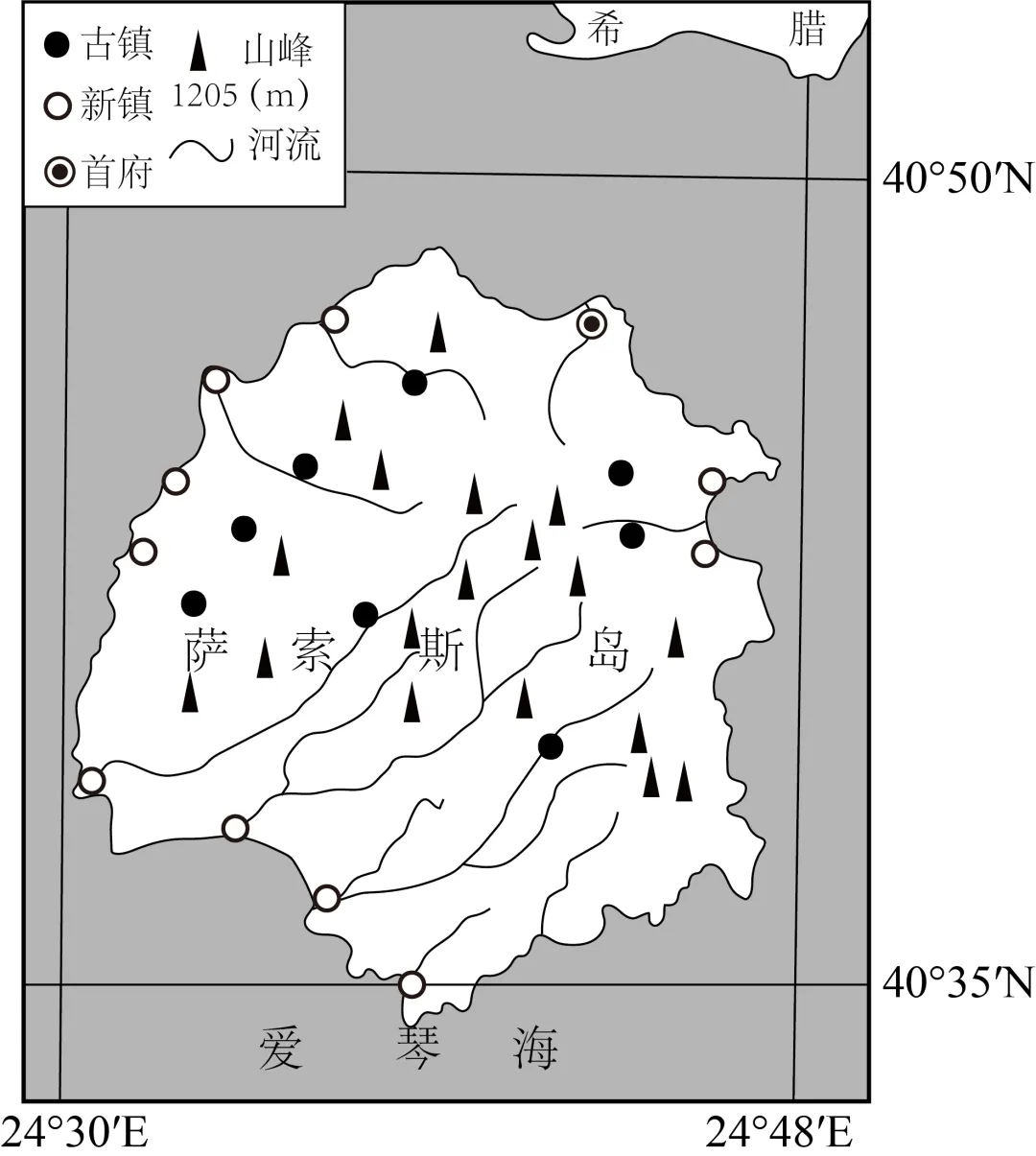 希腊萨索斯岛位于爱琴海北部,地形以山地为主。萨索斯岛历史悠久,早期居民多从事农矿业;20世纪60年代后旅游业发展,居民逐渐移居新镇,形成古镇—新镇的“双子镇”模式。古镇的传统建筑大多坐北朝南,依山而建,排列紧密,建筑材料为天然石材和木材;新镇多为现代建筑。左图为“萨索斯岛古镇与新镇分布示意图”,右图为“萨索斯岛古镇传统建筑景观图”。据此完成下面小题。