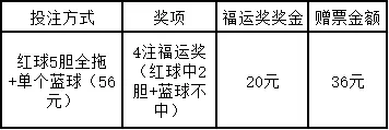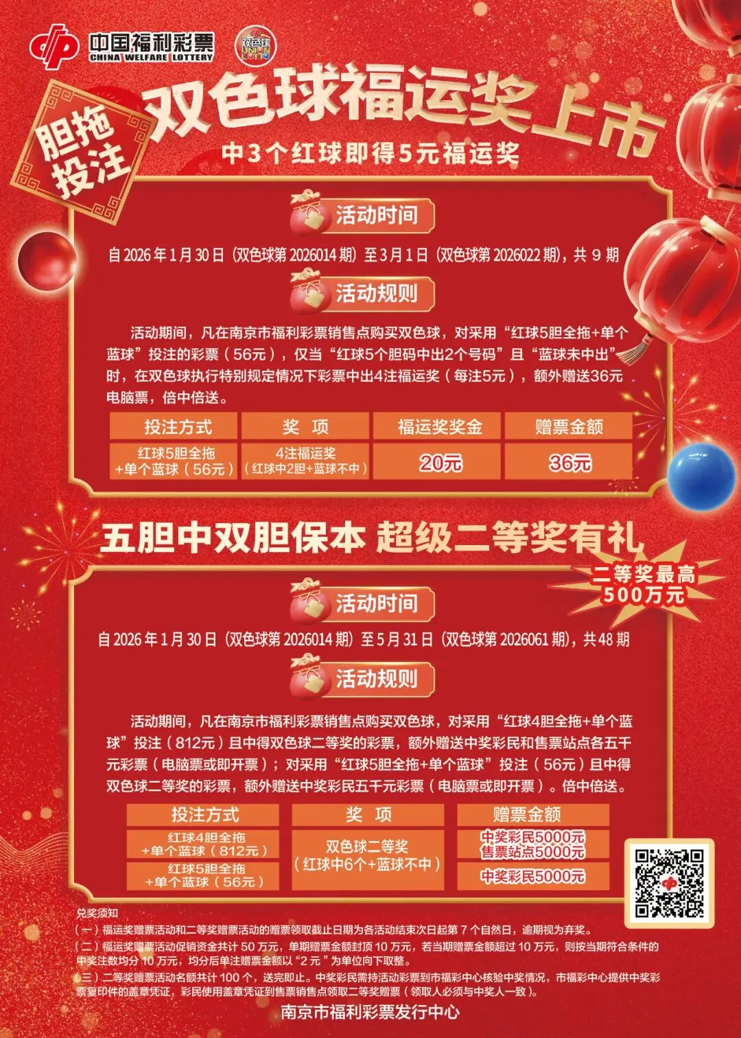 活动期间,凡在南京市福利彩票销售点购买双色球,对采用“红球5胆全拖+单个蓝球”投注的彩票(56元),仅当“红球5个胆码中出2个号码”且“蓝球未中出”时,在双色球执行特别规定情况下彩票中出4注福运奖(每注5元),额外赠送36元电脑票,倍中倍送。