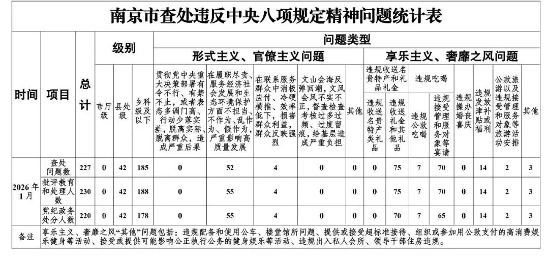 2月28日,南京市纪委监委通报了2026年1月全市违反中央八项规定精神问题查处情况。全市共查处违反中央八项规定精神问题227起,批评教育和处理230人,其中党纪政务处分220人。批评教育和处理县处级干部42人、乡科级及以下人员188人。具体如下:
