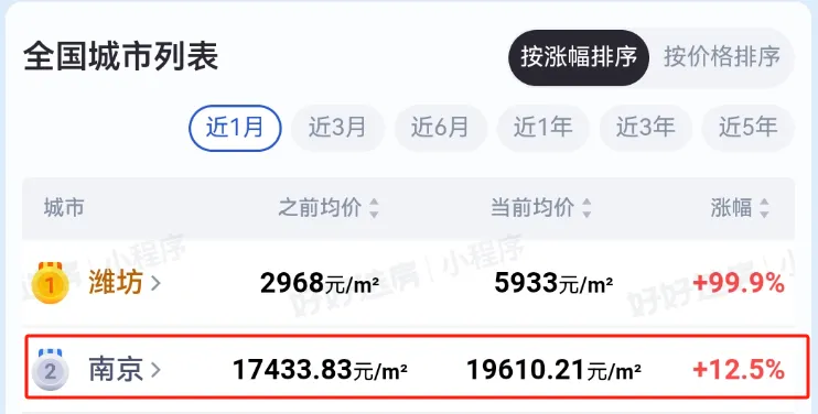根据好好选房数据显示,南京当前成交均价在19610.21元/㎡,近1个月涨幅在12.5%;近3个月的涨幅达到17.1%!