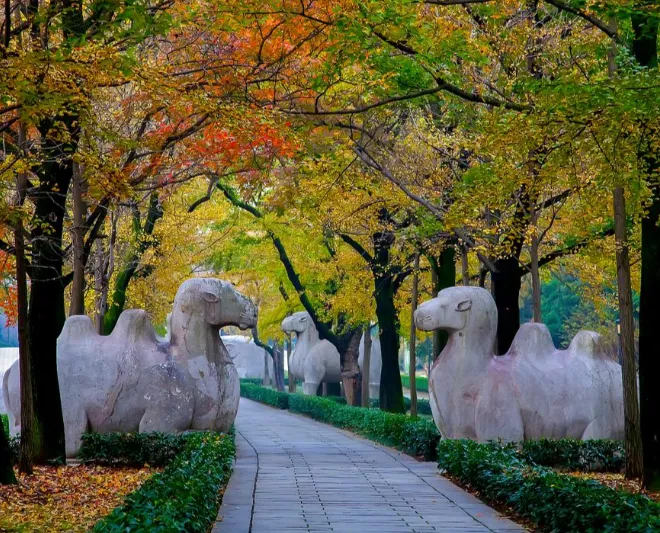 明孝陵石象路被誉为 "南京最美 600 米",深秋时红、黄、橙的乌桕、银杏、枫香构成色彩斑斓的画卷。建议清晨 7 点前或深秋午后拍摄,用长焦镜头压缩空间感,拍出深邃的秋日童话。从明孝陵 4 号门进入,往燕雀湖方向步行,木栈道两旁的枫林会带来惊喜。