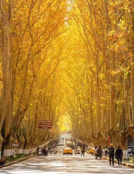 陵园路梧桐大道在秋季呈现出金色隧道的美景,每年 10 月底至 11 月中下旬是最佳观赏期。九十余年后的今天,那些由傅焕光亲手规划的二球悬铃木已亭亭如盖,在秋日阳光中织就一条长 2.6 公里的 "金色穹顶"。建议在明孝陵的 4 号门与 5 号门之间拍摄,这一段是梧桐大道最美的地方。