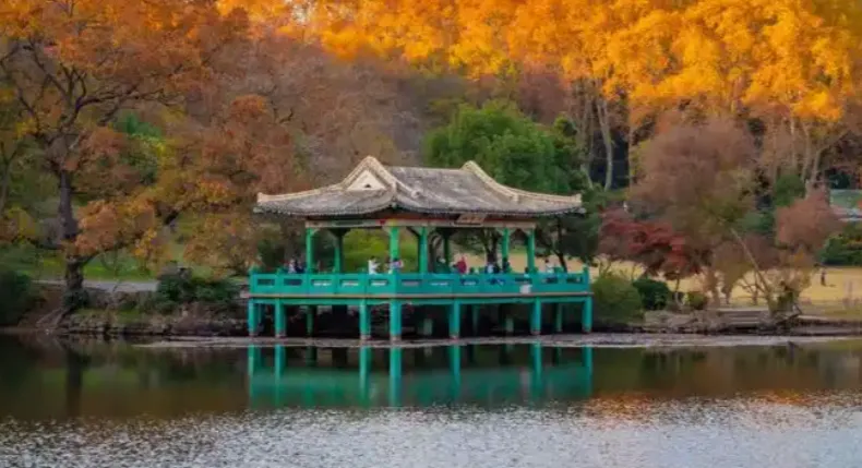 玄武湖公园秋季时湖面平静如镜,周围的树木呈现出金黄、橙红、翠绿等多种色彩,是拍摄湖光山色的理想地点。梁洲的银杏和腊梅也在秋季开放,为玄武湖增添了色彩。