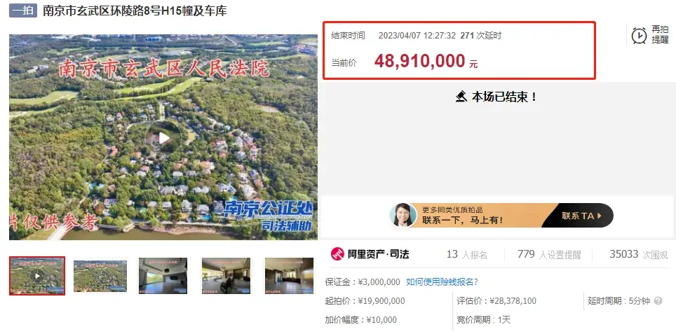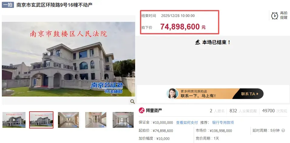 除了上面这套别墅外,南京近几年高价成交的法拍别墅不在少数。2025年12月底,南京紫金山下豪宅钟山高尔夫一套1322.99㎡法拍房高价成交,2人报名,这套法拍房最终成交总价7489.86万,折合单价约5.66万/㎡,底价成交!值得一提的是,钟山高尔夫拍卖的这幢别墅,是南京法拍史上最贵成交单套住宅。钟山高尔夫此次拍卖房产位于环陵路9号16幢,房源建筑面积1322.99㎡,为5层独栋别墅,地下二层,地上三层。