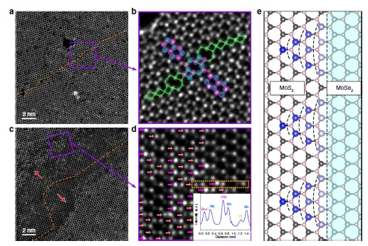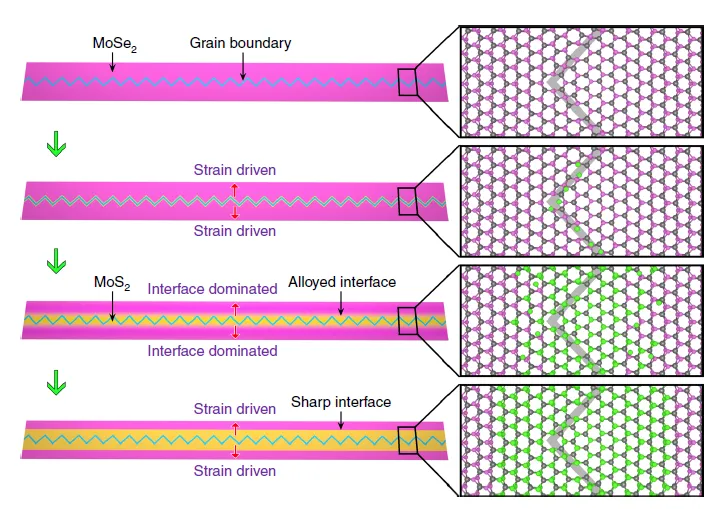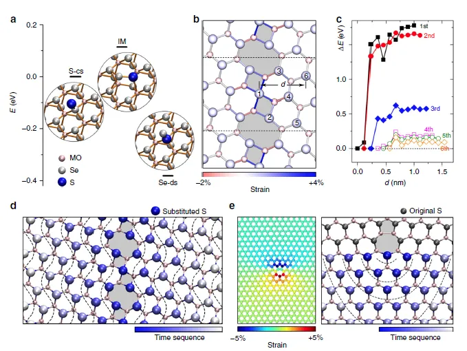 通过第一性原理计算,研究揭示了GBs附近的应变场不仅促进了Se被S的替代,还驱动了MoS2通道从GBs向外的连贯扩展。这种应变驱动的生长机制也被证明适用于其他拓扑缺陷,如位错和点缺陷。