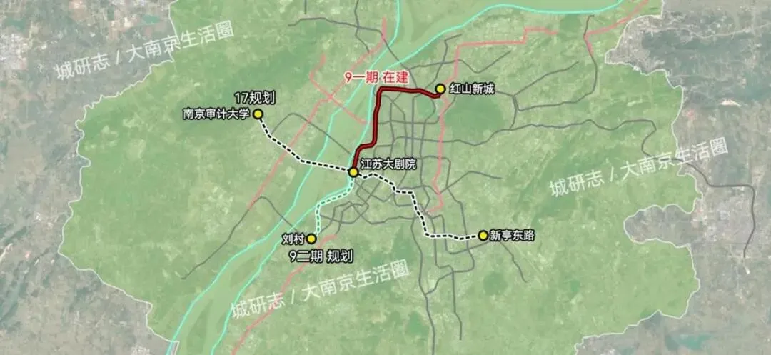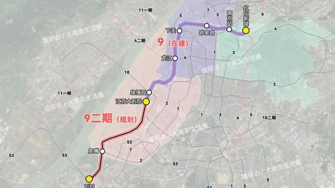 按照规划,9号线二期南起刘村站,北连一期终点江苏大剧院·宪法公园站,全长10.5公里,设有9座车站。这条线路一旦建成,就能第一次把红山新城、南京站、鼓楼、下关滨江和河西中部滨江串成一个整体。