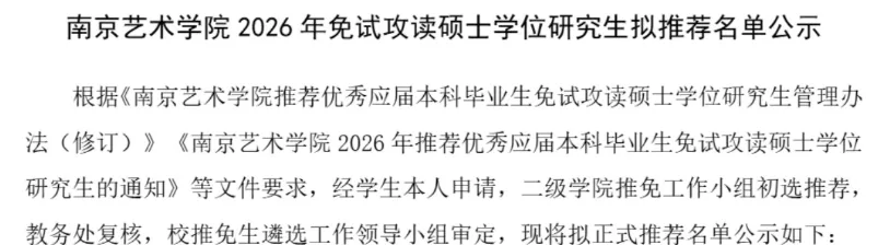 2025年9月,南京艺术学院发布了2026年免试攻读硕士学位研究生拟推荐名单公示。