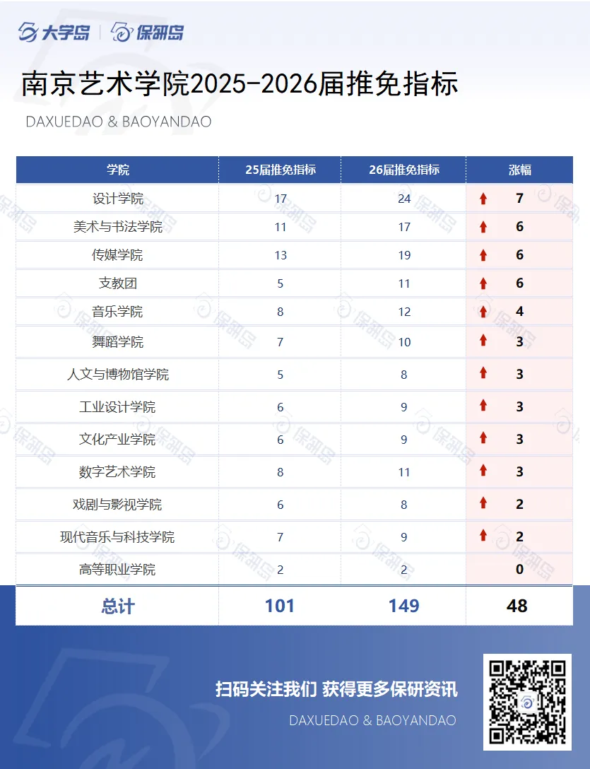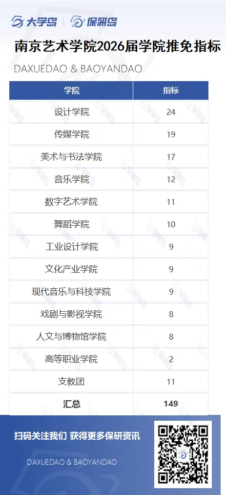 据统计,南京艺术学院2026届推免总名额为149人,其中含研究生支教团11人。各学院分配指标如下: