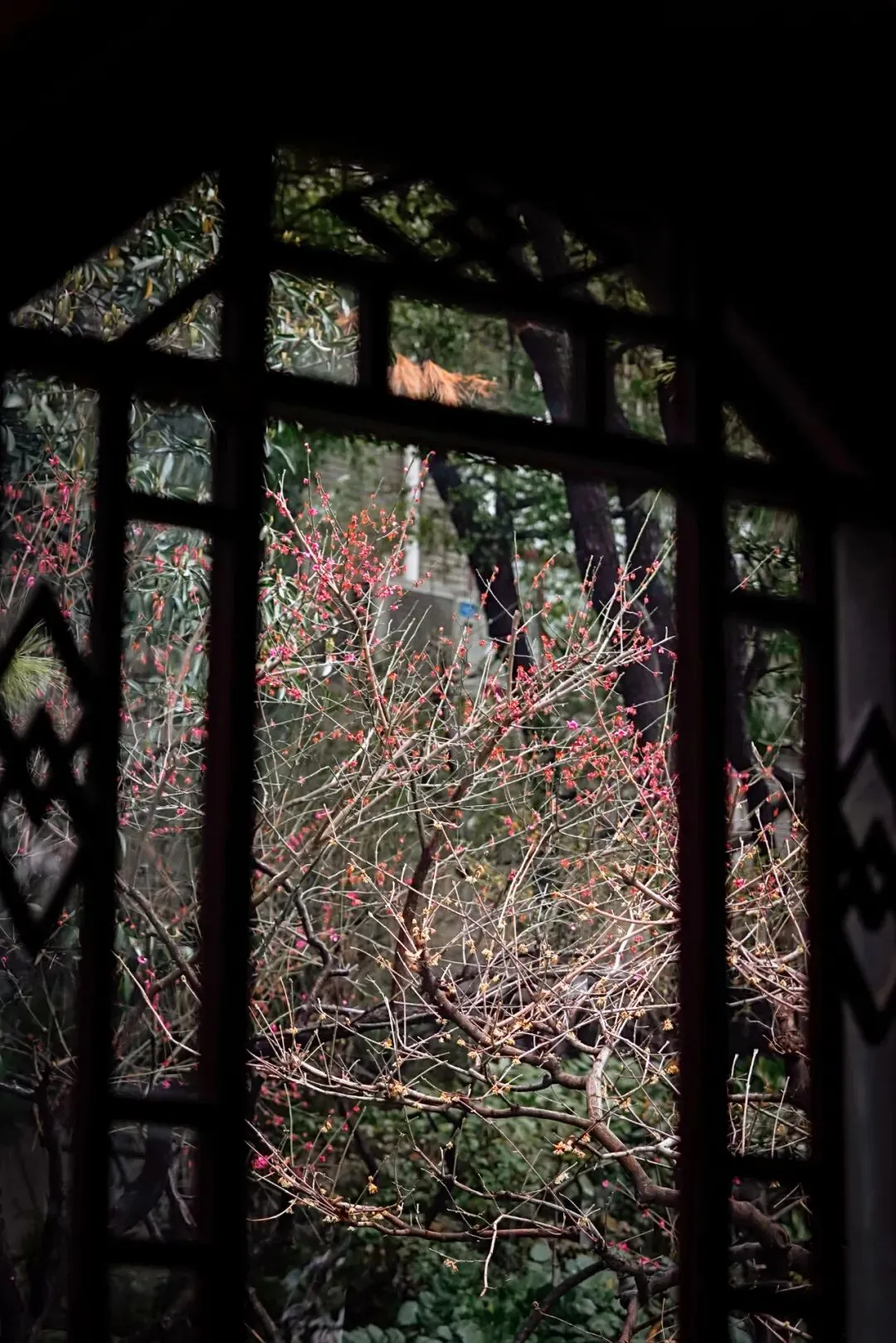 最动人的是窗景:以窗为框,以梅为景,花枝从窗外探入,光影斑驳,不用刻意构图,随手一拍都是干净素雅的中式画面。