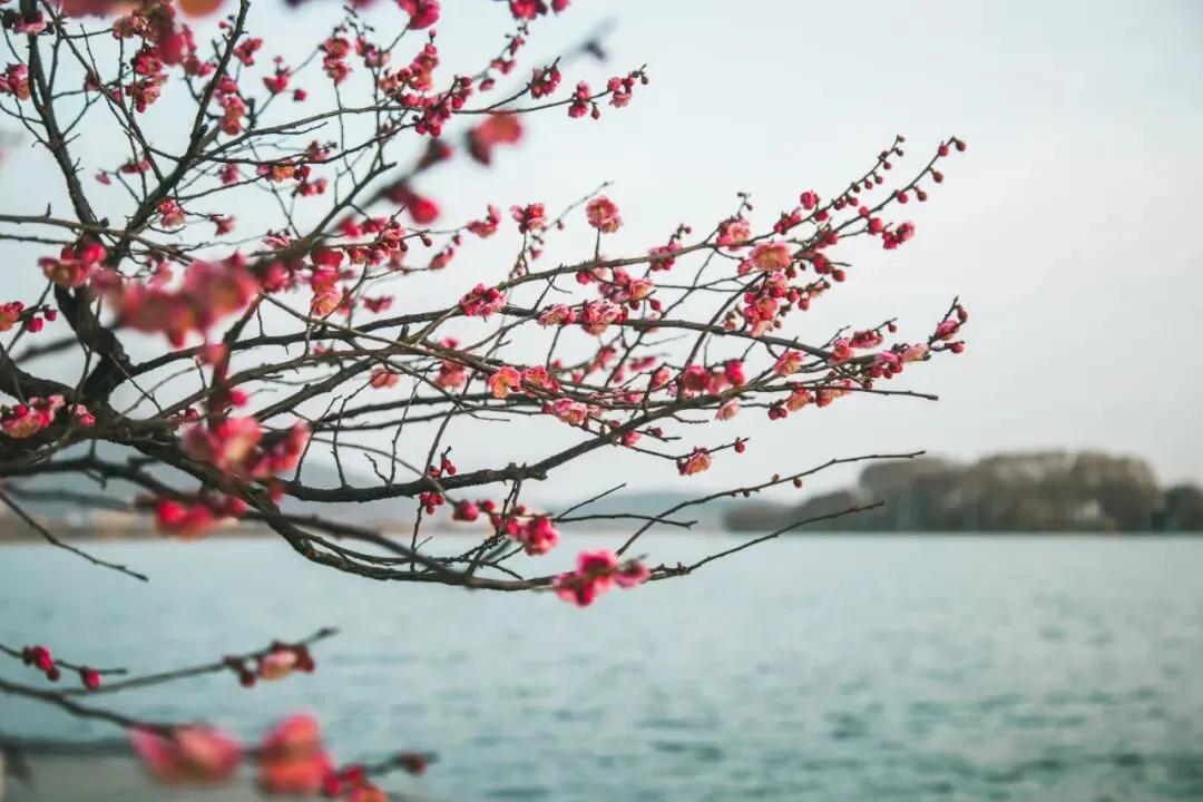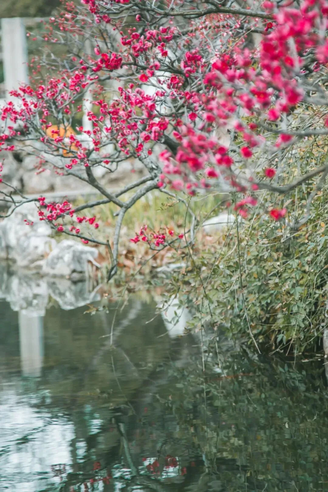 湖面波光粼粼,与赤红的花苞相映成趣,宛若一幅动人画卷。潋滟水光,如梦似幻,和爱人沐浴阳光静坐船上慢慢摇。如果你想打卡孤独的树,可以从玄武门进,步行至梁州即可看见那颗600多年的梅王,氛围感春日大片信手拈来。一路湖风轻拂,梅花沿路开放,不拥挤、不刻意,像一场春日散步。