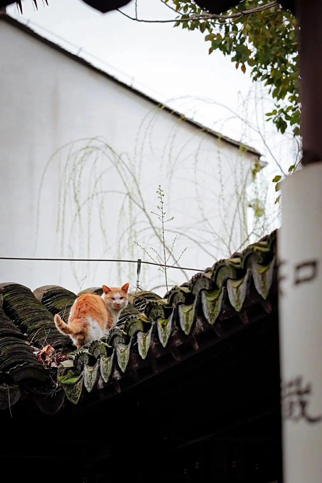 偶然回头间还能瞥见橘猫站立于瓦砾之间,喵喵喵叫个不停。园子里万籁俱寂,一束梅花淡然开着,在长桥回廊,旧梦深深里步步摇曳。
