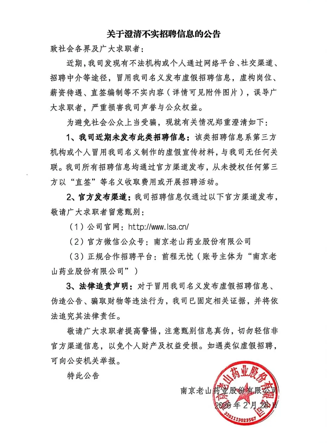 (3)正规合作招聘平台:前程无忧(账号主体为“南京老山药业股份有限公司”)