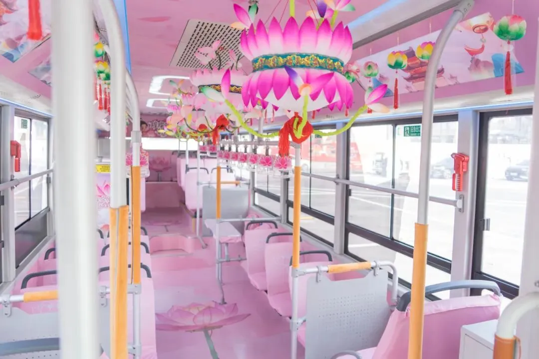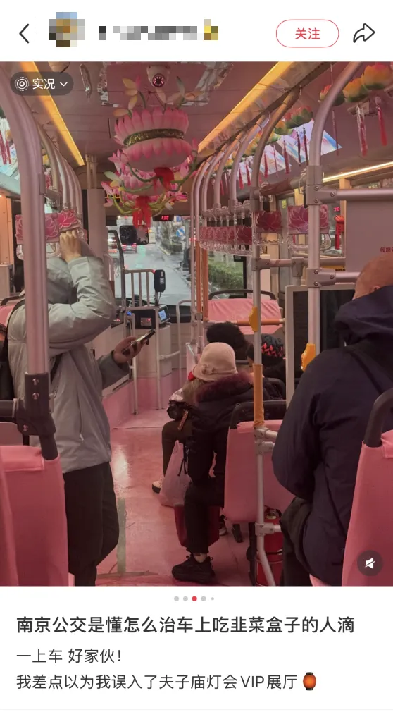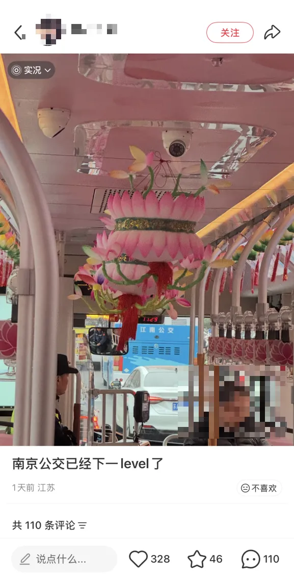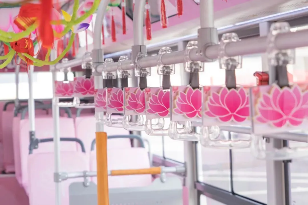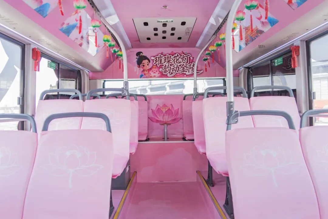 这位网友评论道:“以为误入了夫子庙灯会的VIP展厅!”她细数着眼前的满满细节——头顶的花灯随着车厢轻轻摇曳,脚下踏着荷花的清影,连扶手和椅背都成了沉浸式体验的一部分。