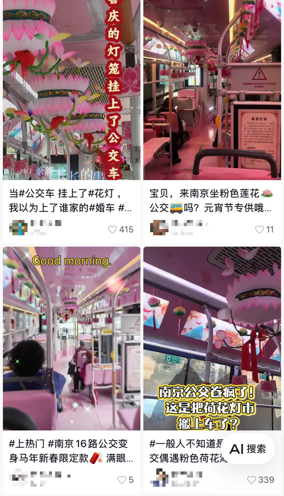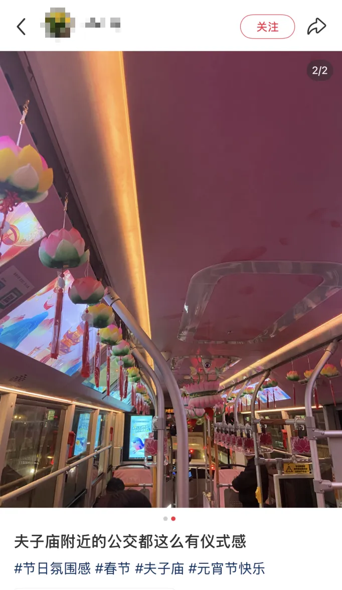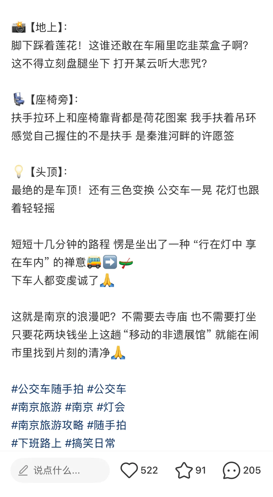这位网友评论道:“以为误入了夫子庙灯会的VIP展厅!”她细数着眼前的满满细节——头顶的花灯随着车厢轻轻摇曳,脚下踏着荷花的清影,连扶手和椅背都成了沉浸式体验的一部分。