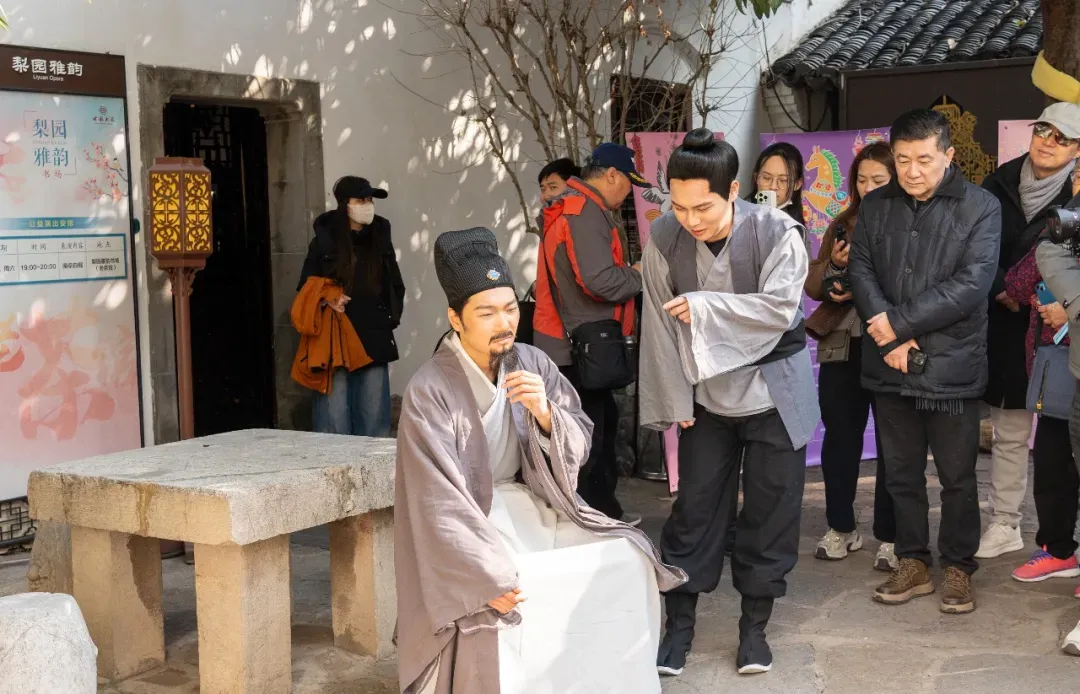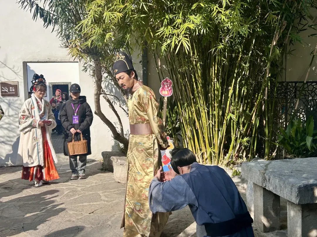 津逮楼前解锁“朱元璋与屠夫”趣味情景剧,揭秘春联起源传说,还能和 “朱元璋” 近距离对春联、抽小红包,福气直接拉满;