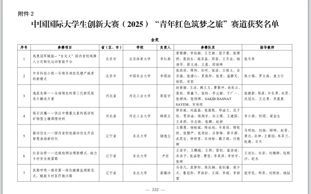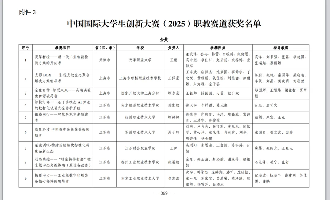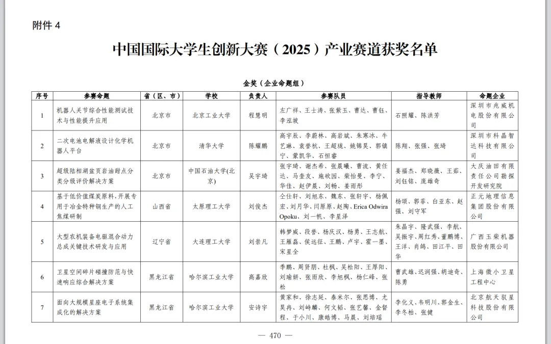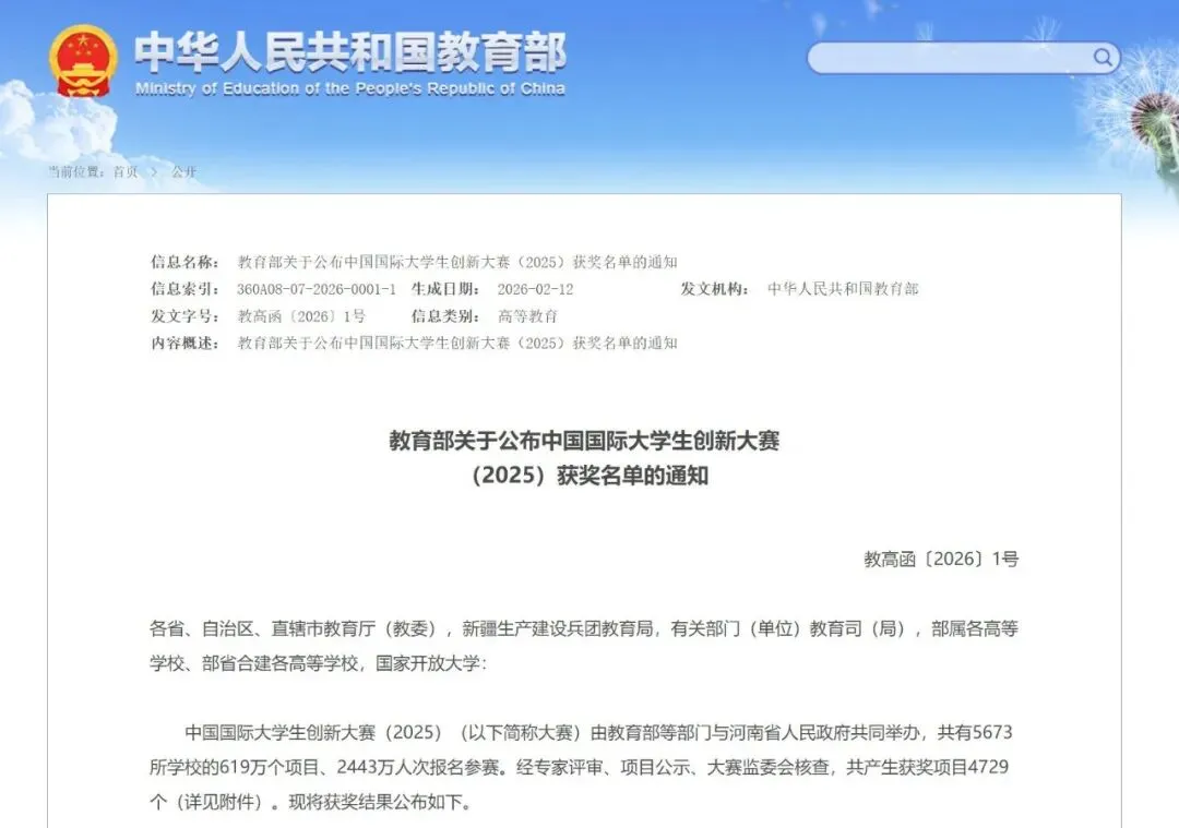 2026年2月28日,教育部发布《关于公布中国国际大学生创新大赛(2025)获奖名单的通知》。中国国际大学生创新大赛(2025)由教育部等部门与河南省人民政府共同举办,共有5673所学校的619万个项目、2443万人次报名参赛。经专家评审、项目公示、大赛监委会核查,共产生获奖项目4729个,分别是: