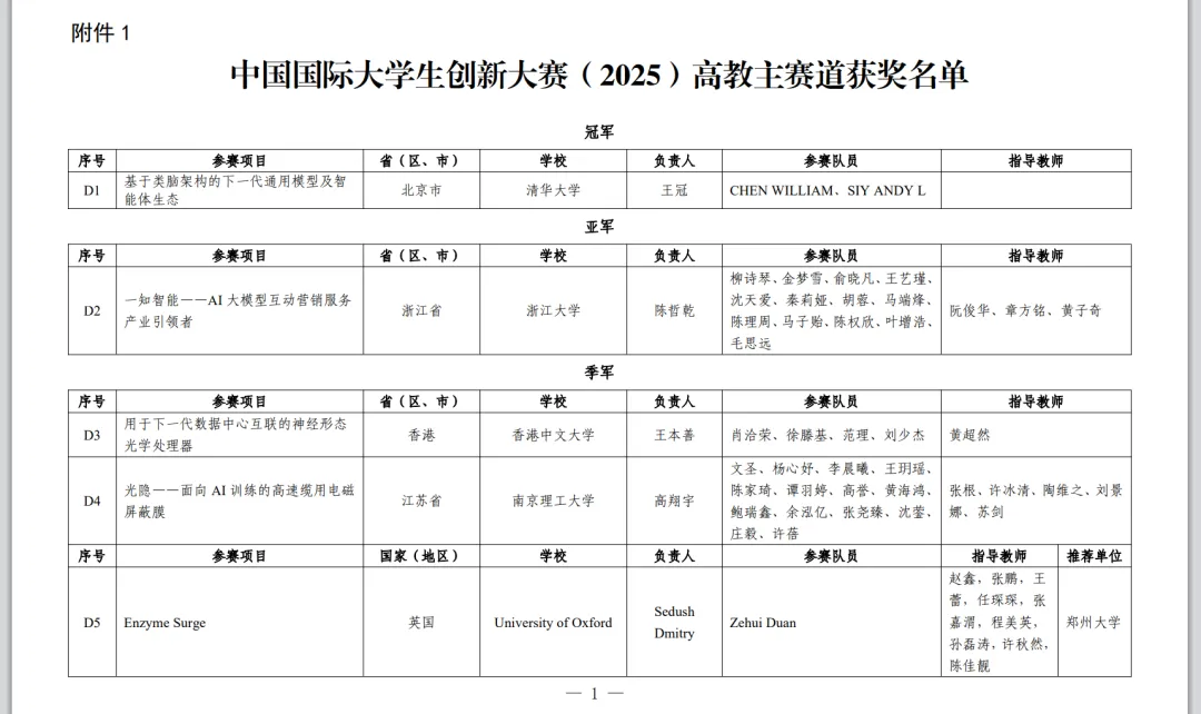 其中,在高教主赛道,清华大学王冠负责的《基于类脑架构的下一代通用模型及智能体生态》项目斩获冠军。浙江大学陈哲乾负责的《一知智能——AI大模型互动营销服务产业引领者》项目获得亚军。香港中文大学王本善负责的《用于下一代数据中心互联的神经形态光学处理器》、南京理工大学高翔宇负责的《光隐——面向AI训练的高速缆用电磁屏蔽膜》、英国牛津大学Sedush Dmitry负责的《Enzyme Surge》、新加坡南洋理工大学Fang Mengwei负责的《BIOV: Genesis Cell Therapy Platform》等四个项目分别获得季军。